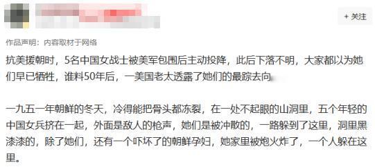 最近刷到一帖子,说抗美援朝时,5名中国女战士被美军包围后主动投降,之后下落不明,