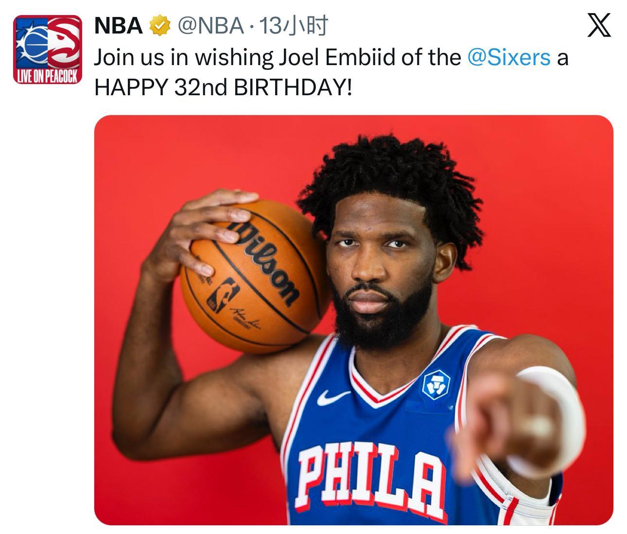 当地时间!费城76人队官方和NBA官方更新社媒动态,发布图文祝福中锋乔尔·恩比德32岁生日快乐!🎂