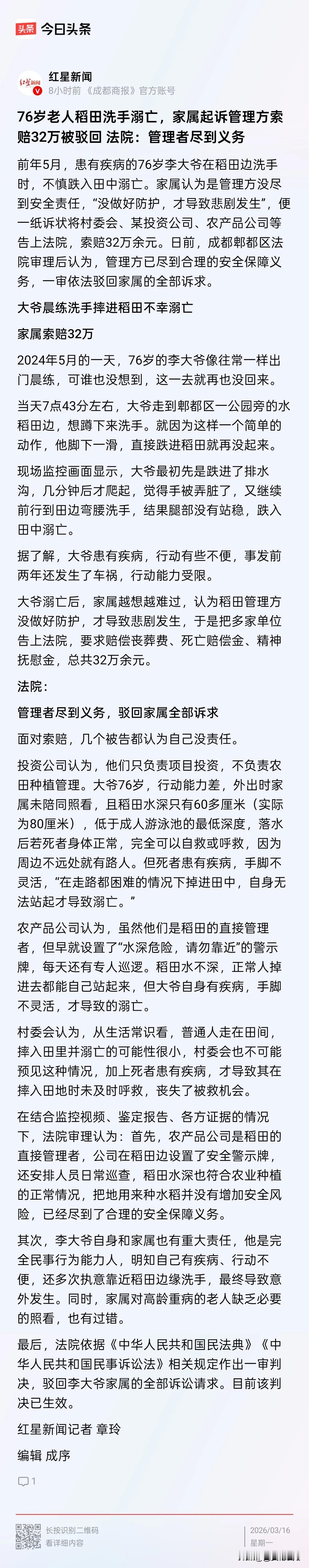 “并非谁死谁有理!”四川成都,一七旬大爷早起锻炼时,路过一片稻田,当他来到稻田边蹲下洗手时,不慎滑倒跌入田中溺亡,而后,大爷的家属难过之余,将村委会、农产品公司告上法院,索赔损失合计320000余元,法院这样判了! 2024年5月的一天清晨,四川成都郫都区76岁的李大爷像往常一样,天不亮就出门晨练。 他身子骨不算太差,只是常年患有疾病,两年前还遭遇过车祸,行动一直有些不便,家人平日里也反复叮嘱他出门注意安全,可他总觉得自己能照顾好自己。 那天他沿着村边的小路慢慢行走,路过一片长势正好的稻田时,不小心脚下一滑,跌进了旁边的排水沟里,挣扎了几分钟后,他才勉强爬了起来,看着手上沾了泥土,又恰逢天气有些闷热,便想着到稻田边接些水洗手降温。 谁也没想到,这一蹲竟成了永别,田埂常年被水汽浸润,本就湿滑难行,李大爷本身行动不便,蹲下后再起身时,腿部没能站稳,整个人直直跌进了稻田里。 尽管稻田水深只有80厘米,远低于成人游泳池的最低深度,可他因为身体患病,手脚不灵活,落水后无法自行站起,最终不幸溺亡。 周边不远处就有路人,等发现时已经来不及,一场本该避免的悲剧,还是悄无声息地发生了。 老人离世后,家属沉浸在巨大的悲痛中,可悲伤过后,他们却将矛头对准了稻田的管理方,认为是对方没有尽到安全保障义务,没有做好防护措施,才导致老人不幸身亡。 随后家属一纸诉状,将村委会、一家投资公司以及负责稻田管理的农产品公司一同告上了法庭,索赔丧葬费、死亡赔偿金、精神抚慰金等各项损失,合计32万余元,要求这些单位为老人的死亡承担全部责任。 面对索赔几家被告都表示自己没有责任,投资公司称,自己只负责项目投资,并不参与农田的种植和管理,不该承担赔偿责任。 农产品公司则表示,他们作为稻田的直接管理者,早就在田边设置了“水深危险,请勿靠近”的警示牌。 而且每天还有专人巡逻,稻田水深也符合农业种植的正常标准,正常人掉进去都能自行起身,老人溺亡的根本原因是自身疾病和行动不便,与他们无关。 村委会也认为,稻田是农业生产用地,并非公共场所,他们无法预见这种意外的发生,老人自身的疏忽才是悲剧的关键。 法院结合现场监控视频、鉴定报告以及各方提交的证据,经过仔细审理后,做出了一审判决,驳回了家属的全部诉讼请求,目前该判决已经生效。 法院认为,农产品公司已经尽到了合理的安全保障义务,稻田的使用和管理都符合相关规定,没有增加额外的安全风险。 而李大爷作为完全民事行为能力人,明知自己行动不便、患有疾病,却依然执意靠近稻田边缘洗手,自身存在重大过错,家属对高龄重病的老人缺乏必要的照看,也应承担相应责任。 这场悲剧确实令人惋惜,七旬老人的意外离世,给家属带来了无尽的痛苦,可悲痛不能成为转嫁责任、索要不合理赔偿的理由。 法律从来不会偏袒任何一方,也不会因为“死亡”就不分对错,“并非谁死谁有理”,每一份责任的划分,都基于事实和法理。 这起判决不仅守住了公平正义,也给所有人提了个醒,意外难免,但凡事要讲情理、守法律,不能让歪理践踏公平。