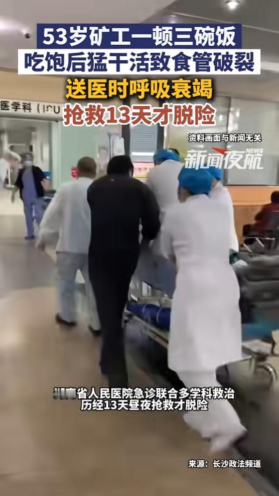 “太吓人了!”近日,湖南,一53岁矿工干完活后饿的发慌,回家后猛吃三碗米饭,加辣椒炒肥肠,刚撂下碗就接着去扛煤土,结果没多久就剧烈腹痛,送医院确诊为食管破裂,诱发呼吸衰竭与脓毒症,抢救了13天才捡回一条命!网友:吃完别猛干! 在湖南郴州,有个53岁的矿工老李,平时身体那是相当硬朗,干了一辈子力气活,谁能想到,竟然差点因为一顿家常便饭把命给丢了。 这事还得从那天下午说起,老李在矿上忙活了大半天,肚皮早就贴后背了,回到家,看着桌上那盘自己最爱吃的辣椒炒肥肠,那是真香啊。 老李也没多想,觉得干体力活就得吃饱才有劲,于是他就着这道“下饭神器”,稀里哗啦连干了三大碗白米饭,在他那辈人的观念里,只有肚子里填满了实实在在的干货,干活才不虚。 碗筷一放,老李连口水都没顾上喝,更别提歇会了,抹抹嘴就直奔矿上去了,到了工地,二话不说就开始扛煤土。 这煤土死沉死沉的,一筐好几十斤,要想扛起来,全靠腰腹那股子憋气劲,老李像往常一样,深吸一口气,气沉丹田,猛地一用力。 就在这股劲刚使出来的瞬间,老李突然感觉肚子里像是有什么东西炸开了,一阵钻心的剧痛瞬间传遍全身。 一开始他还以为是岔气了或者累着了,想咬咬牙挺过去,可没过几分钟,冷汗就像瀑布一样往下淌,疼得他在地上直打滚,连站起来的力气都没了。 旁边的工友一看这架势不对,赶紧七手八脚把他抬上车送到了医院,医生一检查,脸色都变了,老李的食管居然破了个大洞!这可不是小病,破裂的食管导致胃里的食物残渣和强腐蚀性的胃酸全都漏进了胸腔,已经引发了严重的脓毒症和呼吸衰竭,各项生命指标都在报警,人眼看就不行了。 医生打了个比方,老李这胃当时就像个吹得鼓鼓的气球,本来肚子里就塞满了三碗饭和肥肠,压力已经很大了。 结果他刚吃完就去干重活,一憋气、一用力,腹腔压力瞬间飙升,这“气球”受不了这么大的挤压,直接就在最薄弱的食管那“砰”地一声爆了。 为了抢救老李,医院也是拼了,胸外科、重症医学科的专家全都上了阵,把他送进了ICU(重症监护室)。 插着呼吸机,挂着吊瓶,抗感染、稳住呼吸、24小时盯着监护仪,医生护士轮流守着,生怕死神趁虚而入,老李的家属在外面也是度日如年,天天守在门口抹眼泪。 好在老李平时身体底子确实好,再加上送医及时,医生抢救得力,在鬼门关前转悠了整整13天后,老李终于挺过来了,气管插管拔掉的那一刻,他算是彻底捡回了一条命。 转出ICU后,老李回想起这事,吓得脸都白了,他说自己干了一辈子活,总觉得“吃饱了好干活”是铁律,哪知道这差点成了自己的催命符,以后就是打死他,也不敢吃饱了撑着去卖力气了。 这事传开后,大家都在感慨,有的网友说:“这真是拿命换来的教训,饭后歇一歇,神仙也得歇啊。”还有的说:“老观念真得改,机器还得预热呢,何况是人肉长的身子。” 医生也借着老李这事给大家提了个醒:特别是干重体力活的朋友们,千万别信什么“吃饱了立马干活才有劲”的鬼话。 吃完饭,血液都跑去胃里消化食物了,这时候要是立马剧烈运动或者负重,肠胃压力大不说,还容易脑供血不足。 正确的做法是,吃完饭至少得歇个一两个小时,等食物消化消化,而且别吃太撑,八分饱就足够了,干重活之前,也尽量少吃那些太辣、太油的东西,不然肠胃负担太重,真容易出事。 老李遭的这番罪,给咱们所有人都上了一课。挣钱固然重要,但身体才是革命的本钱。 别为了赶那一点时间,或者为了多干那一点活,就把命搭进去。吃饱了,坐下来歇会,喝口茶,等身子舒坦了再干,平平安安回家,比啥都强。 对此你怎么看? 信源:时间视频