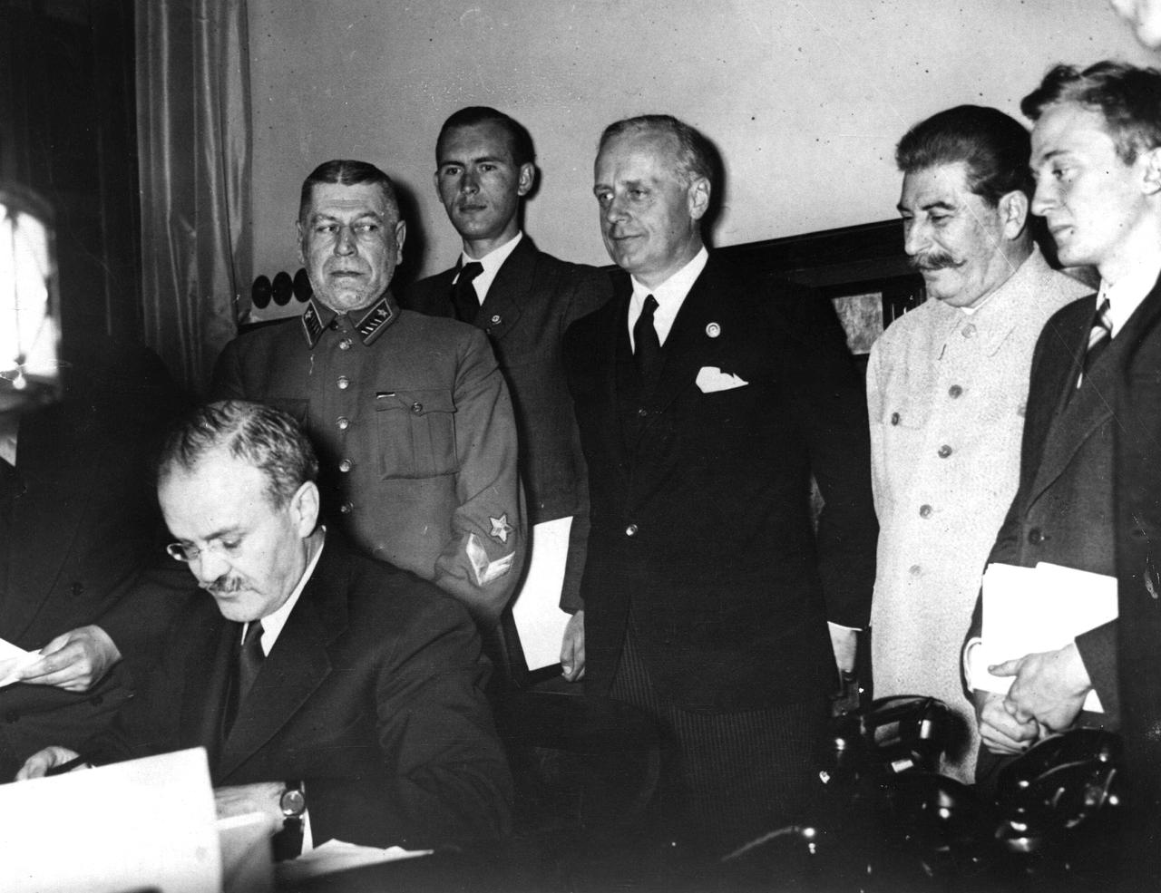 [呲牙] 二战前,各列强、各小国、各阵营的种种结盟与敌对,就是现在来看也是波谲云诡——1939 年 9 月 28 日,苏联与第三帝国签署 《苏德友好与边界条约》。 图1是苏联外交人民委员维亚切斯拉夫・莫洛托夫签署 《条约》,在他身后站立的是德国外交部长约阿希姆・冯・里宾特洛甫与约瑟夫・斯大林。 图2,站立者从左至右分别为: 鲍里斯・米哈伊洛维奇・沙波什尼科夫 — 红军总参谋长 里夏德・舒尔策 - 科森斯 — 德国外交官 约阿希姆・冯・里宾特洛甫 — 德国外交部长 约瑟夫・斯大林 弗拉基米尔・尼古拉耶维奇・帕夫洛夫 — 苏联驻德国代表团一等秘书 《苏德友好与边界条约》是 《苏德互不侵犯条约》的补充条约,进一步划分了苏德在东欧的势力范围,巩固了两国在瓜分波兰后的边界与利益划分。