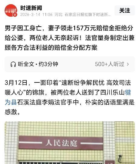 四川乐山,一男子工伤死亡,赔偿款157万元打到妻子账上,妻子认为,这笔钱归自己和孩子所有,丈夫死亡,这是他们未来的保障,可公婆老年丧子,身体衰弱,也想分走一部分养老,公婆问儿媳要钱,儿媳一分不给,公婆告到法院,结果令人意想不到。 妻子拿着这笔钱,心里又痛又慌,痛的是丈夫不在了,家里的顶梁柱倒了,慌的是今后自己要独自抚养两个孩子,还要应对家里的各种开销。 在她看来,这笔钱就是她和孩子们未来的救命钱,是丈夫用命换来的,理所当然该归她和孩子所有,公婆有自己的微薄积蓄,就算没有这笔钱,也能勉强维持生活,所以她压根没打算把钱分给公婆一分。 可公婆这边,遭遇了老年丧子的沉重打击,本来就身体衰弱,常年需要吃药看病,儿子没了,他们就没了依靠,养老成了最大的难题。得知赔偿款有157万元,全部在儿媳手里,老两口心里不是滋味,他们没想着多要,只希望儿媳能分一部分给他们,够他们晚年养老、看病就行。 老两口先是找儿媳好好商量,语气温和地说出了自己的想法,可儿媳态度坚决,一口回绝,说这笔钱跟他们没关系,一分都不会给。 几次沟通下来,儿媳始终不肯松口,甚至开始躲避公婆,连电话都不接。老两口看着儿媳的态度,又想到自己晚年无依无靠,心里又急又寒,实在没办法,只能硬着头皮,把儿媳告上了法院,希望通过法律途径,要回属于自己的那一部分赔偿款。 当时周围的人都在议论,有人说儿媳太绝情,公婆老年丧子已经够可怜了,分一部分钱给他们养老也是应该的。 也有人说儿媳没错,她要独自带孩子,未来的日子不好过,这笔钱确实该留着养孩子、维持家用。大家都以为,法院要么会判儿媳分一部分钱给公婆,要么会支持儿媳,让公婆空手而归,可最终的结果,却出乎了所有人的意料。 法院受理案件后,并没有直接下判决,而是考虑到这是家庭内部纠纷,一旦判决不当,只会彻底割裂亲情,让这个本就破碎的家庭雪上加霜。法官多次召集双方当事人沟通,一边安抚双方的情绪,一边耐心讲解相关的法律规定,让双方都明白自己的权利和义务。 法官明确告诉双方,工伤死亡赔偿款既不是死者的遗产,也不是夫妻共同财产,而是对死者近亲属的整体补偿,配偶、子女、父母都是合法的受益人,都有权利参与分配。分配的时候,要兼顾各方的实际需求,对老年人、未成年人等弱势群体予以适当倾斜。 经过法官多次调解,双方终于放下了隔阂,达成了一致意见:公婆共分得40万元,用于晚年养老和看病;死者已经成年的长女分得30万元,作为她未来的发展资金。 未成年的次子分得50万元,由妻子代为保管,专门用于孩子的抚养、教育和生活开支。除此之外,公婆和长女还自愿放弃了对死者其他遗产和商业保险赔偿金的继承权利。 这个结果,既保障了公婆的养老需求,也兼顾了妻子和孩子的生活,没有让亲情彻底破裂,算得上是最圆满的结局。其实说到底,这笔157万元的赔偿款,每一分都是用生命换来的,本该是用来抚慰亲人伤痛、保障亲人未来生活的,而不是用来引发家庭矛盾、割裂亲情的。 现实生活中,类似的纠纷并不少见,很多家庭因为赔偿款的分配,闹得反目成仇,忘了亲人之间最珍贵的情谊。 遇到这种事,双方都该多站在对方的角度想一想,儿媳要体谅公婆老年丧子、无依无靠的难处,公婆也要理解儿媳独自带孩子的不易,互相体谅、互相让步,才能妥善解决问题。 更重要的是,大家要多了解相关的法律知识,不要像本案中的儿媳一样,误以为赔偿款只归自己和孩子所有,也不要像有些老人一样,盲目索要赔偿款。只有懂法、守法,才能更好地维护自己的合法权益,也才能避免因为金钱,伤害了最亲的人。