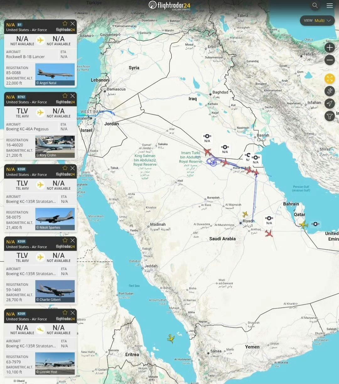 B-1B“枪骑兵”重型轰炸机从以色列特拉维夫起飞,在KC-135R加油机陪同下经过沙特、卡塔尔前往伊朗。