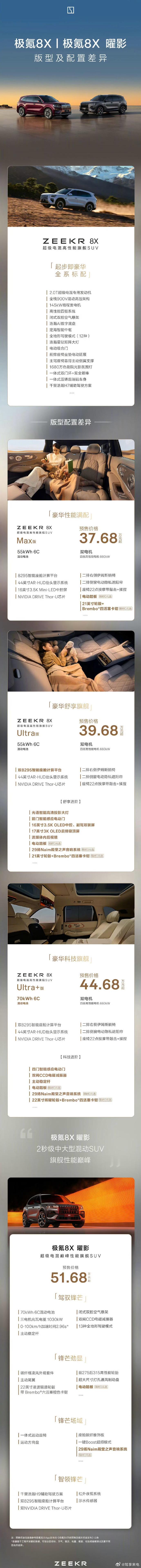 极氪8X预售37.68万起极氪全新旗舰来袭!极氪 8X 正式开启预售,37.68 万起,直接杀入高端纯电 SUV 核心战场。新车定位中大型豪华纯电 SUV,外观延续极氪家族凌厉设计,气场拉满。内饰科技感与豪华感双在线,大尺寸联屏、高品质用料、宽敞空间,精准击中高端家庭用户。三电与智驾全面拉满,高性能版零百加速进入顶级梯队,续航、快充、操控全部拉满。37.68 万起的预售价格,在同级别里极具竞争力,直接对标豪华品牌与高端新势力车型。极氪 8X 的到来,进一步完善极氪高端阵容,也让 30—50 万市场卷得更激烈,准备换车的可以重点蹲住!