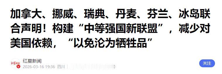 欧洲6国要建新群,4大盟友转向中国,特朗普玩砸了美国百年基业 3月15号,加拿大总理卡尼把挪威、瑞典、丹麦、芬兰、冰岛的头头脑脑召集到奥斯陆。六国坐下来谈了谈,最后发了份联合声明,内容涉及北极安全、集体防御、经贸合作,还有量子计算、人工智能这些高科技领域。 要是不仔细琢磨,大家可能觉得这就是一次普通的国际会议,毕竟这些国家平时也经常有往来。可只要稍微一想,就会发现不对劲,这里面的门道可不少。 这六个国家,本来都是有靠山的,全都在北约的保护范围之内,平时有美国罩着,不用太担心安全问题。尤其是加拿大,跟美国是邻国,隔一条边境线,以前好得跟穿一条裤子似的,美国说东,加拿大很少敢说西,妥妥的美国铁杆盟友。 可现在呢?他们居然自己私下拉了个群,开会、发声明,全程没跟美国打招呼,直接把美国晾在了一边。 这可不是一时兴起,更不是闹着玩的,背后全是对美国的不满,尤其是对特朗普政府的不满,说白了,就是觉得跟着美国混,越来越没奔头,还不如自己抱团取暖,再找个靠谱的合作伙伴。 说到这,就不能不提特朗普干的那些事,正是他的一系列操作,把美国攒了上百年的盟友关系,一点点给砸毁了。特朗普上台之后,就一直奉行“美国优先”,不管不顾盟友的利益,凡事只想着美国自己占便宜,对盟友要么呼来喝去,要么威胁施压,半点大哥的样子都没有。 就说北约军费这事儿,特朗普一直盯着盟友们要钱,以前要求盟友们把军费开支提高到本国GDP的2%,后来还不满足,直接加码到5%。 要知道,很多欧洲国家的军费开支连2%都达不到,一下子提到5%,无疑是给这些国家增加了巨大的财政负担,西班牙首相直接明确拒绝,说这是国家主权范围内的事,2%的开支已经足够履行承诺了。 更让盟友寒心的是,特朗普还公开放话,如果盟友不按时交够军费,美国就不会保护他们,把“盟友”当成了需要交保护费的小弟。 除了催要军费,特朗普还干了不少让盟友寒心的事。他曾经公开嚷嚷着要买下丹麦的格陵兰岛,遭到拒绝后,就对丹麦施加压力,丹麦首相直接说,这种压力是完全不可接受的。 自家的领土被美国惦记,换谁也不会心甘情愿,这也让丹麦彻底看清了美国的真面目——眼里只有利益,根本不把盟友的主权放在眼里。 更过分的是,特朗普还签署行政令,对全球所有国家加征10%的进口关税,这其中就包括美国的这些欧洲盟友。 关税一加,盟友们的商品出口受到很大影响,企业损失惨重,可特朗普根本不管这些,只想着保护美国本土企业,完全不顾盟友的死活。这种自私自利的做法,让越来越多的盟友对美国失去了信任,觉得跟着这样的大哥,只会吃亏上当。 也正是因为这样,欧洲这6个国家才决定自己拉群,不再一味依赖美国。他们心里清楚,跟着美国,不仅得不到实实在在的好处,还会被美国绑在战车上,随时可能陷入麻烦。与其这样,不如自己抱团,在安全、经贸、高科技等领域互相合作,既能保障自身利益,也能掌握自己的发展主动权。 更让美国没想到的是,除了这6个国家私下建群,美国的4个铁杆盟友——加拿大、英国、法国、德国,也开始悄悄转向中国。 有民调显示,加拿大近六成的受访者认为,中国比美国更可靠;英国、法国、德国认为中国更靠谱的比例,也都超过了美国。这可不是随口说说,而是这些国家民众的真实想法,背后更是这些国家的实际选择。 这些国家之所以转向中国,很简单,因为中国能给他们带来实实在在的好处,而且中国一直奉行平等互利、合作共赢的原则,从不强迫盟友选边站,也不会像美国那样动辄威胁施压。 美国能有今天的地位,靠的不仅仅是自身的实力,更靠的是攒了上百年的盟友体系。二战之后,美国花了七八十年时间,拉拢欧洲盟友,建立北约,构建起自己的势力范围,靠着这个体系,美国当了半个多世纪的世界老大,说一不二。 可现在,特朗普的一系列操作,把这个体系彻底搅乱了,盟友们离心离德,要么自己抱团,要么转向中国,曾经坚不可摧的盟友关系,变得不堪一击。 特朗普总说自己在“让美国再次伟大”,可实际上,他正在亲手毁掉美国百年基业。他把“美国优先”变成了“美国独行”,眼里只有自己的利益,不顾盟友的感受,最终导致盟友纷纷疏远,美国的影响力也越来越弱。 欧洲6国建群,4大盟友转向中国,这不是偶然,而是特朗普一手造成的。美国百年积累的信任和盟友关系,被他当成柴火烧了个精光。