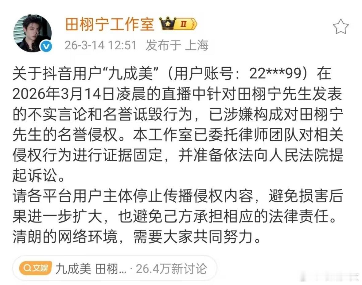 造谣者曾向田栩宁公开道歉所以造谣一张嘴,辟谣跑断腿,最后换来的就是一句轻飘飘的“对不起”?田栩宁这件事,造谣者眼看要被告了赶紧道歉求和解,问题是当初传“隐婚生子”的时候不挺能说的吗?