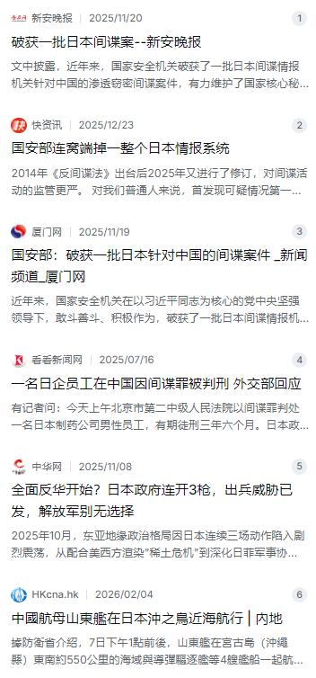 稀土、航母、经济反制都吓不住日本,唯独这招,让它怕了! 麻烦看官老爷们右上角点击一下“关注”,既方便您进行讨论和分享,又能给您带来不一样的参与感,感谢您的支持! 近年来,日本政府在台海、东海这些问题上,那真是没消停过,一个劲儿地在那儿挑衅。咱们这边呢,航母出去巡航了,导弹也试射了,甚至稀土出口都拿捏起来了,算是给足了警告。可你猜怎么着?日本那边摆出一副死猪不怕开水烫的架势,硬着头皮顶在那儿,嘴硬得很,好像啥招都不好使。 可最近这一两个月,风向突然就变了。咱们国家安全机关一发力,接连破获了好几起日本籍人员的间谍案,这一下,东京那边是真有点坐不住了,那个慌张劲儿,跟之前判若两人。看来,这招才是真正打在了他们的七寸上。 说起来,这可不是空穴来风。就在2025年11月19号,国家安全部的官方账号发了篇文章,里头明确提到,这几年咱们已经破获了一批日本间谍情报机关针对中国的渗透窃密案件 。这话虽然简短,但分量极重,等于官方盖了章了:日本对咱们的情报渗透,那是成系统、有组织的,而且已经被咱们一锅端了不少。 更具体的事儿,媒体也挖出来了。比如2025年7月,就有一个在日本制药公司当高管的男子,因为间谍罪被判了三年半 。这可不是小角色,能当上高管,潜伏得有多深?他们平时西装革履的,张口闭口谈合作、搞科研,背地里却是在偷我们的医保数据、新药研发参数 。这不就是典型的当面一套背后一套吗? 还有些案子,听着都让人后背发凉。有的日本人打着文化交流、地理考察的幌子,跑到咱们山东、海南那边,拿着勘探设备到处晃悠。后来一查,哪是搞什么温泉开发,分明是在偷偷测绘咱们的航母基地和核潜艇基地坐标 。这要是把精确坐标弄到手,真到了那天,这不就是给导弹指路吗?还有的在黑龙江那片黑土地上,以学术研究为名,偷偷采集咱们的水稻、大豆种子,把基因数据往回传 。粮食安全是命根子,他们连这个都不放过。 最让人警觉的是,有些间谍隐藏得极深。有在日本搞了30年所谓“中日友好交流”的老面孔,结果被揪出来是间谍 。这就好比披着羊皮的狼,整天在你身边晃悠,跟你称兄道弟,背地里却在给主子递刀子。这种渗透,已经不是什么秘密了,有专家通过数据分析,推测潜伏在中国的日本间谍可能数量惊人 。虽然具体数字没法核实,但足以说明问题的严重性。 面对咱们依法清理这些“钉子”,斩断他们情报链的行动,日本那边的反应才叫有意思。按道理说,你家的人跑别人家干坏事被抓了,你该道歉反省吧?人家不,反而倒打一耙,跳出来指责中国的司法“不透明”,还“极为遗憾” 。但这种强硬的姿态没撑两天,他们的政坛和舆论场就露怯了。为啥?因为心里有鬼啊。他们清楚,这些被抓的人,不是普通的游客或者商人,而是他们几十年来辛辛苦苦布下的眼线,是花了巨大成本培养的情报资产。 这一下被连根拔起,损失的不只是几个人,而是整条情报战线。据说咱们这次行动,不是零敲碎打,而是“批量打包”,同一时间收网,把他们安插在关键岗位上的“钉子”一个个拔掉 。这种雷霆万钧的手段,对日本情报机构的心理冲击是巨大的。他们这才发现,自己以为隐蔽得很好的网络,其实早就在咱们的监控之下,所谓的“对中国一清二楚”,不过是在看咱们想让他们看的“剧本”罢了 。 这么一对比,态度反差就出来了。以前咱们反制经济,他们硬扛;咱们秀肌肉,他们也硬扛。可一旦咱们在看不见的战线上动了真格,开始清理门户,他们立马就慌了。因为这事儿戳中了他们的核心利益——情报搜集能力。没有准确的情报,他们就成了瞎子和聋子,无论是军事冒险还是外交博弈,都没了底气。 咱们的反间谍行动,那是堂堂正正、合理合法。任何一个主权国家,都不可能允许外国情报人员在自己地盘上肆意妄为。国家安全高于一切,这道理走到哪儿都说得通。这回用事实给某些人上了一课:有些底线,碰不得。