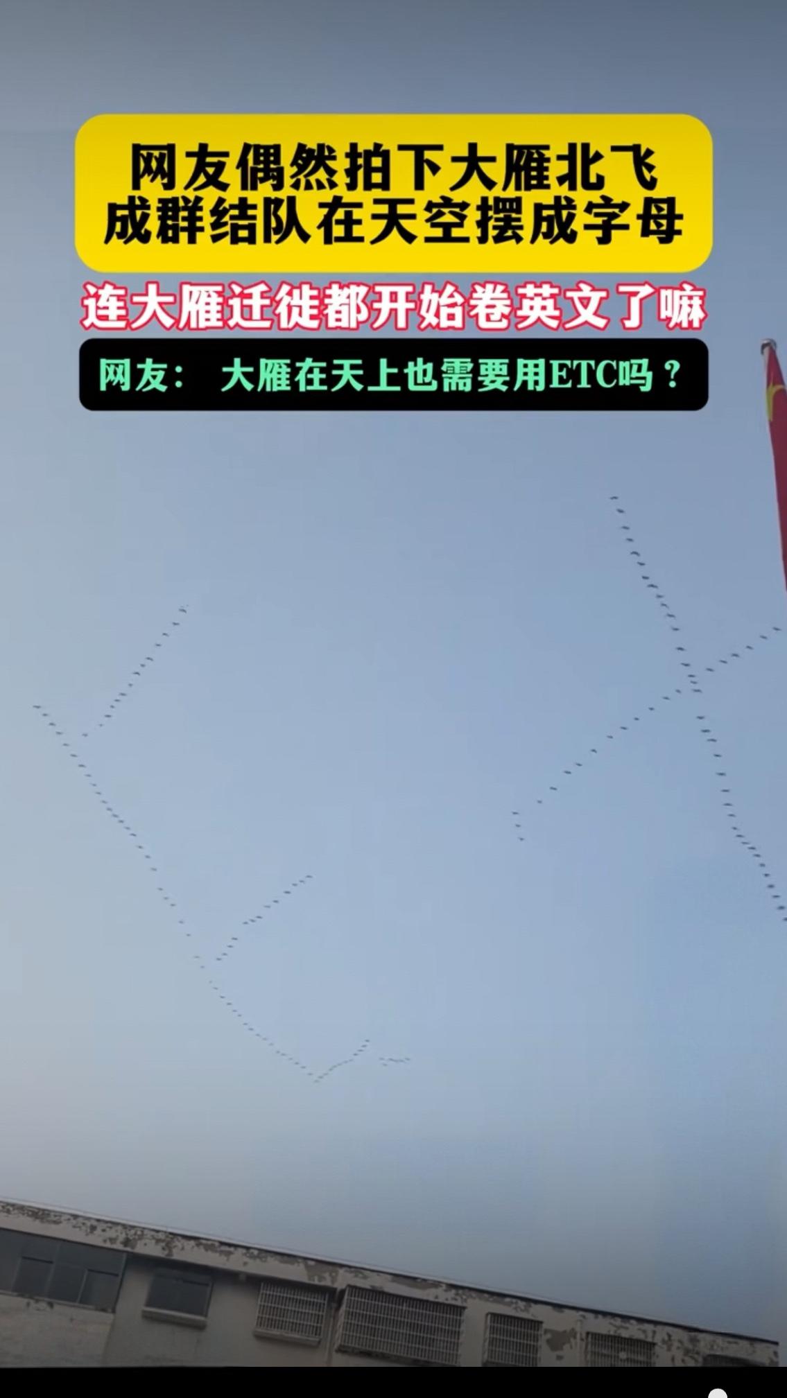笑疯!大雁北飞竟排成英文队形,连迁徙都开始卷,网友:天上也办ETC了? 谁能想到,有一天我们会被一群大雁“卷”到! 网友偶然拍下震撼一幕:成群大雁北飞,不再是熟悉的“人”字、“一”字,而是整齐划一地摆出英文字母阵型,仿佛天空成了它们的展示台。这一幕瞬间炸翻全网,网友脑洞直接拉满:连大雁迁徙都开始卷英文了?这是要出国深造吗? 更有网友神吐槽直击灵魂:“大雁在天上也需要用ETC吗?”“建议严查,是不是偷偷办了VIP快速通道”“我连英语四级都没过,大雁已经会空中拼写了,输得彻底”。评论区笑作一团,明明是自然奇观,硬是被玩成了全民玩梗现场。 看似搞笑的背后,藏着最朴素的治愈。我们每天埋头赶路,被生活推着走,被内卷、焦虑包围,却很少抬头看看天空。而这群大雁,用一场巧合的排列,给枯燥的日子添了一抹惊喜。它们不懂英文,更不知道ETC,只是遵循本能,向着温暖与家园奋力前行。 这世上最动人的风景,从不是刻意摆拍,而是自然不经意的浪漫。我们调侃大雁“内卷”,其实是在羡慕它们:目标明确,结伴同行,不问前程,只管飞翔。 生活不必时刻紧绷,偶尔抬头看看天,像大雁一样,找准方向,稳步前行。毕竟,真正的高级,从来不是盲目跟风,而是活成自己最舒服的模样。 你抬头见过最治愈的天空景象是什么?评论区聊聊~迁徙大雁 大雁迁徙季