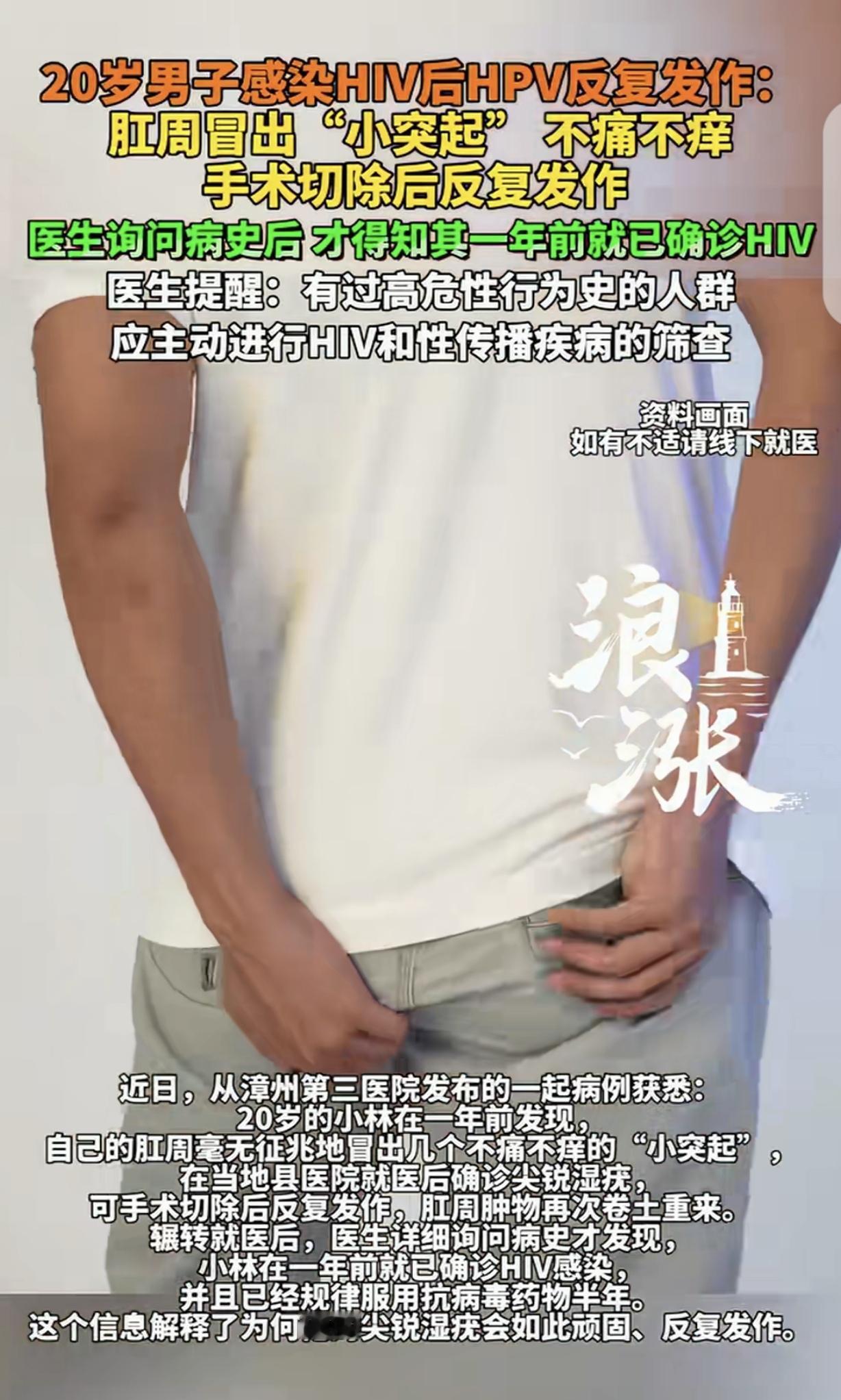 “这就是放纵的后果!”福建漳州,一20岁小伙,突然发现肛周长出很多“肉疙瘩”,不疼不痒,被确诊是HPV,手术切除后,竟然反复长,医生一问,才发现小伙1年前就确诊了HlV,医生恍然大悟,原来是艾 滋患者,怪不得反复发作呢。网友:都HlV了,还在乎HPV发作?后期各种癌症还并发呢,所以说,一定要洁身自爱呀! 20岁的小林,发现肛周长出好多“肉疙瘩”,不疼也不痒,就没太当回事。 可随着时间推移,这些“肉疙瘩”越来越多,他这才慌了神,赶紧去医院。 医生经过检查,确诊他感染了HPV,就是人乳头瘤病毒,也叫尖锐湿疣。 随后,小林接受了手术切除治疗,本以为做完手术就好了,可没想到,没过多久,那些“肉疙瘩”又反复长了出来。 医生也觉得纳闷,按常理手术切除后不该这么快复发啊。 于是,医生仔细询问小林的生活情况和过往病史。这一问,真相浮出水面。 原来,小林在1年前就被确诊感染了HIV,也就是艾 滋。 医生这才恍然大悟,HIV感染者的免疫系统遭受严重破坏,身体对各种病毒的抵抗力大幅下降,HPV自然就容易反复发作。 小伙得知这一结果后,整个人都懵了。他怎么也没想到,自己当初的放纵行为,会带来如此严重的后果。 他回想起自己曾经不注重健康,没有正确的观念,随意发生不安全的行为,才一步步导致这样的结果。 这件事在网上传开后,网友们议论纷纷。有人说:都HIV了,还在乎HPV发作?后期各种癌症还并发呢。 这话虽然有些尖锐,但却说出了残酷的现实。HIV感染者由于免疫系统崩溃,不仅容易反复感染HPV,还可能引发卡波西肉瘤、淋巴瘤等多种癌症,生命健康受到极大威胁。 这起事件给所有人都敲响了警钟。年轻人往往觉得自己身体好,对健康问题不够重视,在那方面也比较随意。 但健康不是儿戏,一次放纵可能就会改变整个人生轨迹。洁身自爱不仅仅是一种道德要求,更是对自己生命健康负责的表现。 我们每个人都应该树立正确的观念,做好防护措施。 同时,也要关注自己的身体状况,定期进行体检,一旦发现异常及时就医。 别等到疾病缠身才后悔莫及,那时再多的悔恨也换不回健康的身体。希望这个小伙的遭遇能让更多人警醒,珍惜健康,远离放纵。 《治安管理处罚法》第66条规定:卖y、嫖 娼的,处十日以上十五日以下拘留,可以并处五千元以下罚款;情节较轻的,处五日以下拘留或者五百元以下罚款。 小林的不安全行为虽没直接构成卖y嫖 娼,但这类行为是传播HIV、HPV等病的主要途径。 该法条旨在通过约束不当行为,遏制疾病传播。 小林因放纵导致自身染病,不仅自毁健康,也可能间接威胁他人。 对此,你怎么看?