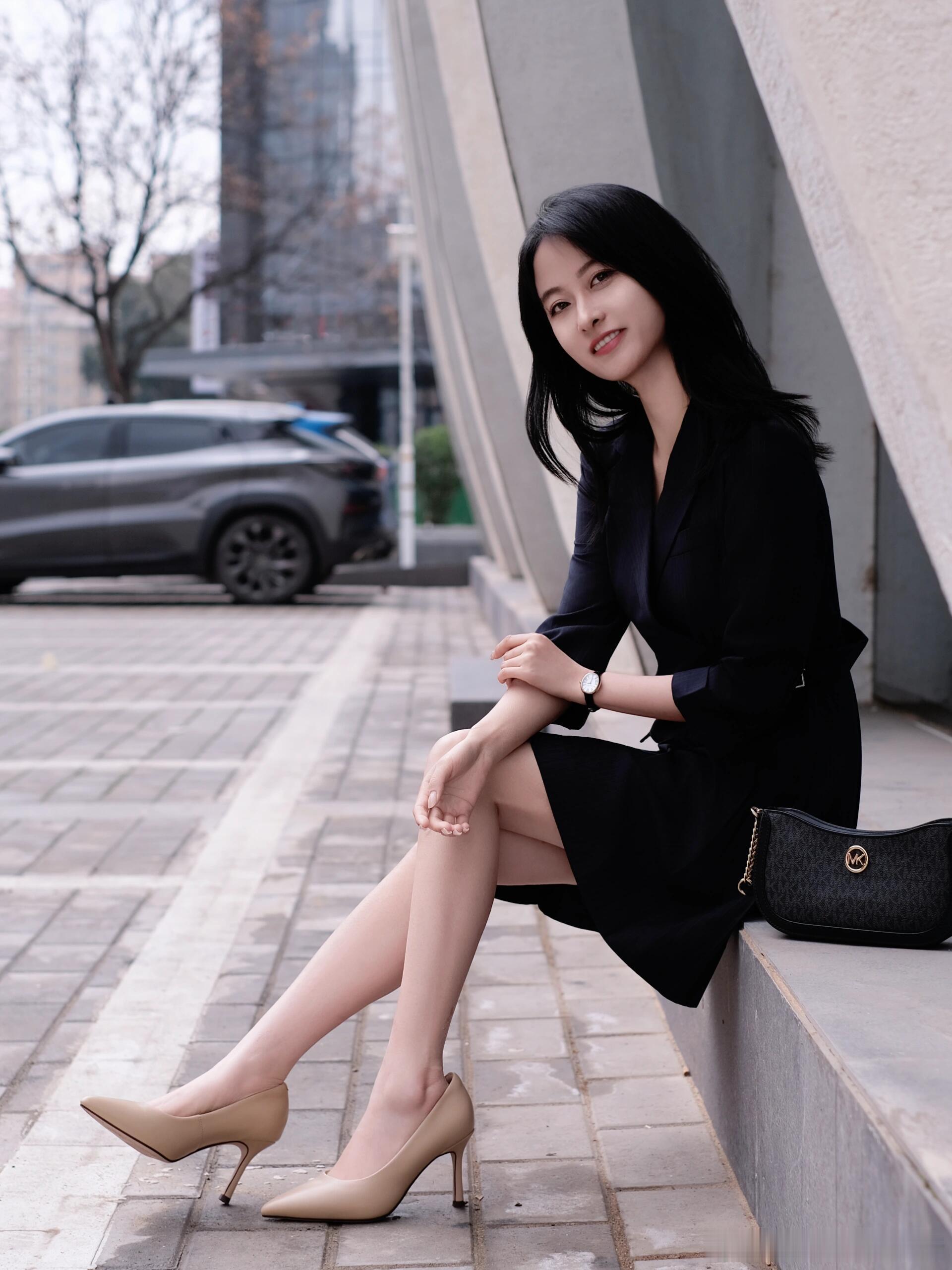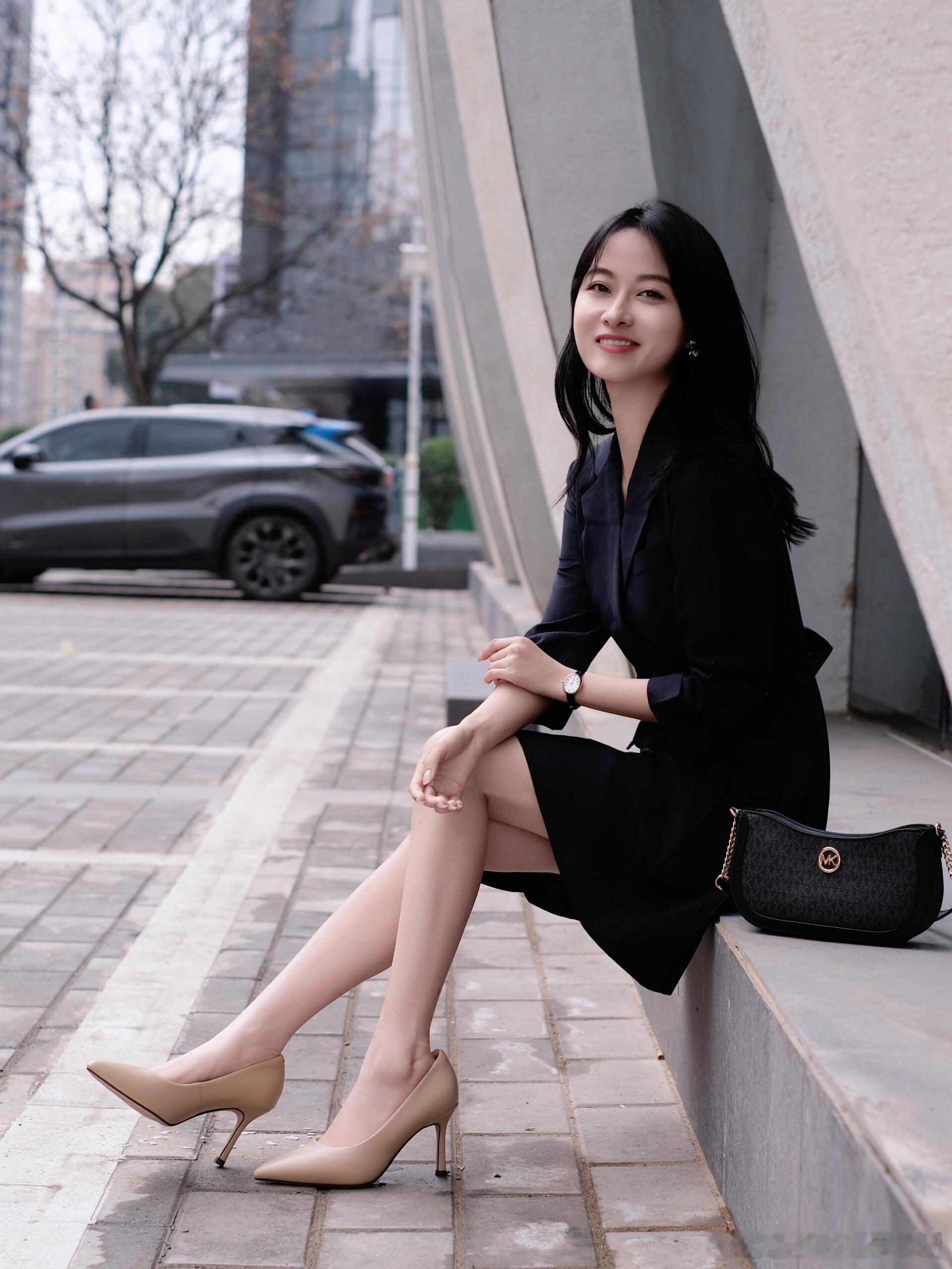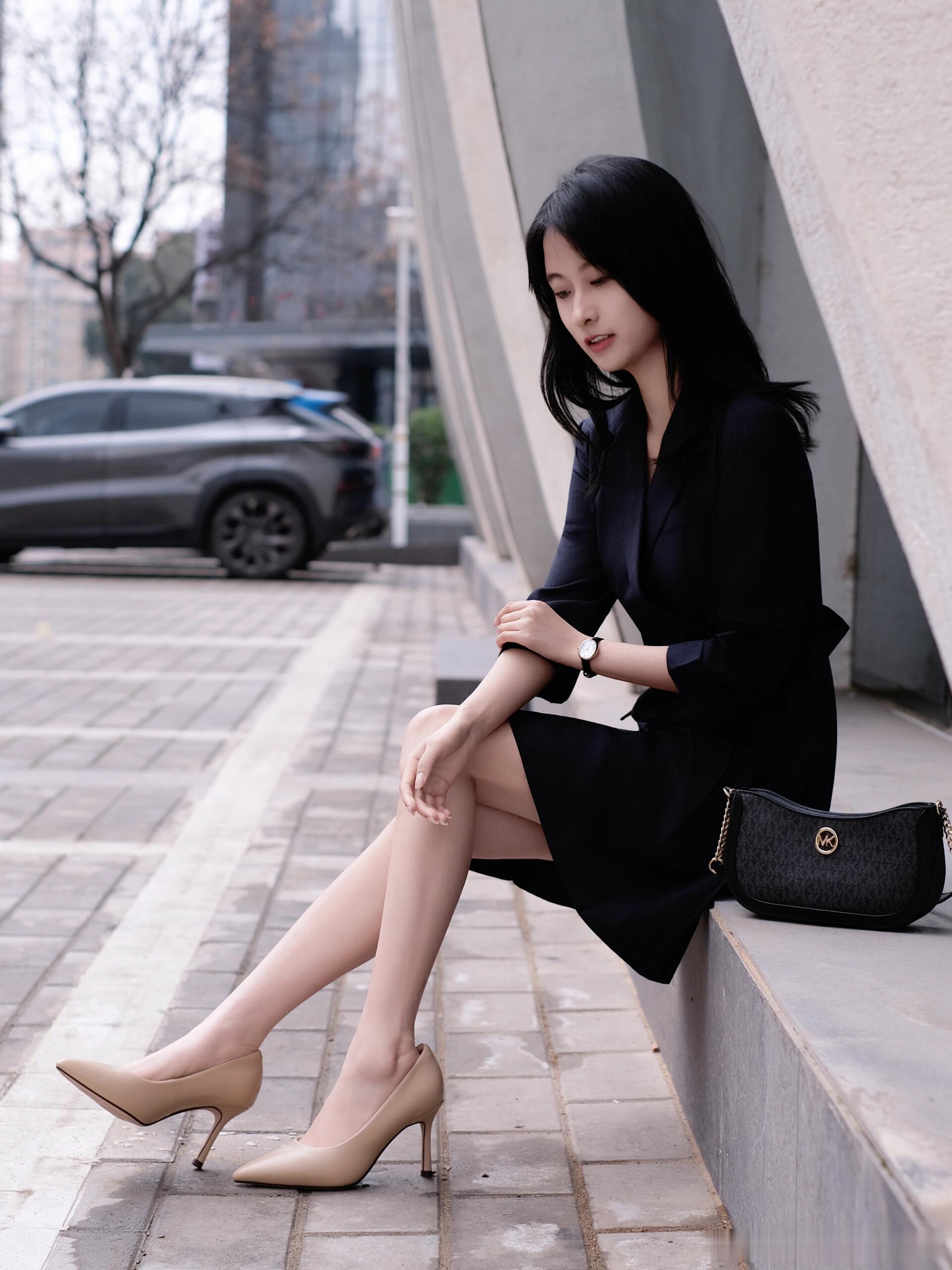 复古风穿搭,优雅气质,黑白配高跟鞋,时尚眼镜,石阶上的静谧时光。