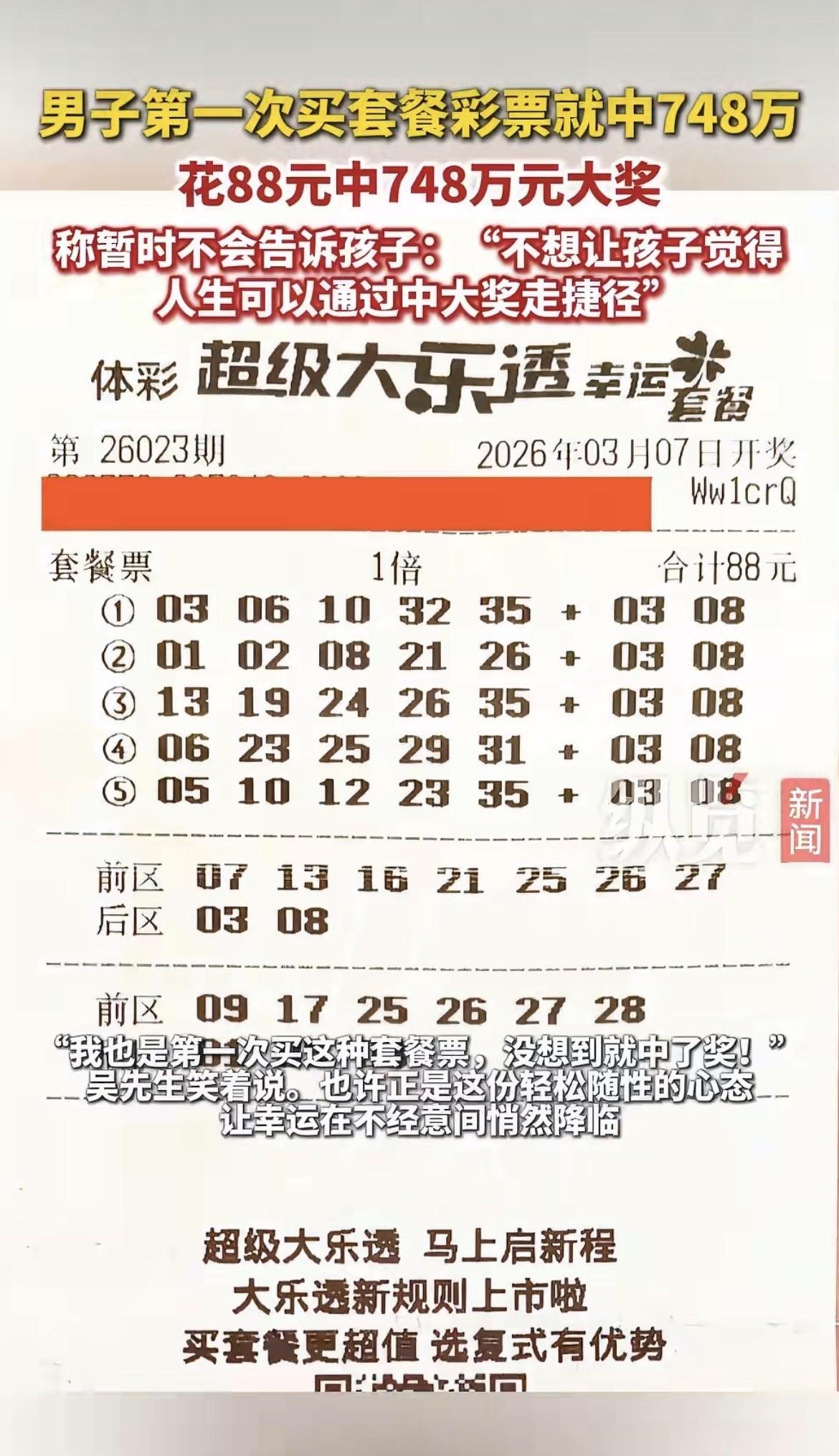 绍兴吴先生中了748万, 不告诉孩子, 家里真安静。 他就在上虞东关一家小店买了张88元的套餐票,没想到中了一等奖。 他自己都笑了,说第一次买这种,纯属碰运气。 他有两个娃,一个正上初中,他说不想让孩子觉得人生可以靠运气翻身,想让他们靠自己努力。 所以领完奖,谁都没张扬,连孩子也瞒着。 可新闻一出来,朋友圈、短视频全在转。 他接受采访很实在,也没躲,但话里透着一种小心——怕孩子听见后,想法就变了。 他打算拿奖金改善家里条件,再专门存一笔给孩子读书用。 不是不给,是想等他们再大点,能明白钱背后的责任。 这事挺真实,不像演的,也没啥煽情话。 他就是个普通爸爸,碰上了大事,选择先闷头想清楚。 他没说错什么,也没做错什么。 就那样。