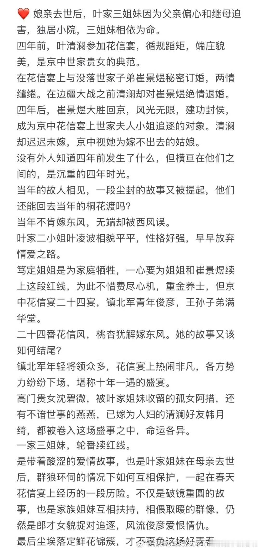 一看就像根據剛合作生命樹編的ip沒聽說過,無感私以為一切非大女主的“女群像”對頭部和女流量都不是好餅.要分清步步甄嬛那種很大女主之後的“群像”和几女几對的“群像”哈,几女几對的“群像”餅只要是头部和女流量都应该nonono,留给半红半糊们扎堆吧
