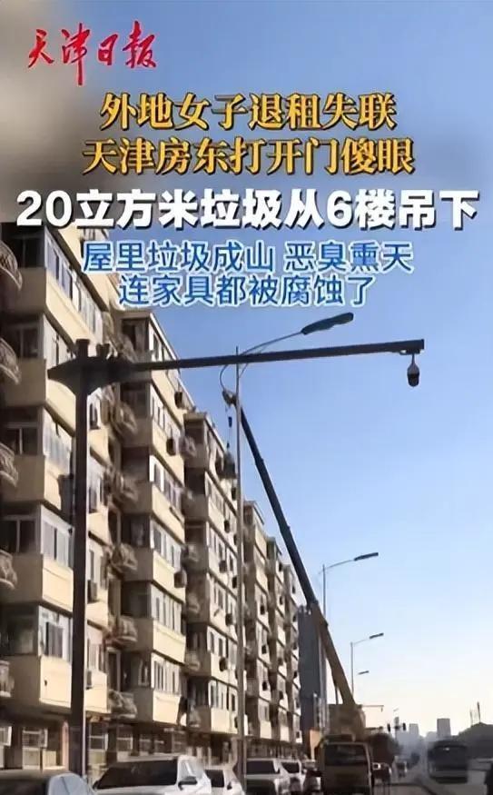 就很离谱!外地一女子退租失联,天津房东无奈打开门后直接傻了眼。房东阿姨:她住的时候挺爱干净的。 “她刚住进来的时候,干干净净的一个小姑娘,怎么就把房子搞成了这样?” 天津红桥区的王阿姨到现在都想不通。前几天,她站在自己那套40平米的房子里,看着工人们用吊车把一袋袋垃圾从六楼窗口吊下去,整整吊了一天。 这套房子在红桥区芥园街立兴里小区,六楼,没电梯。几年前王阿姨把它租给了一个年轻姑娘,当时签了合同. 头两年一切都正常,姑娘话不多,房租从来不拖欠。后来熟了,合同到期也就没再续签,就靠口头约定,到日子王阿姨去收租,姑娘给钱,就这么过了好几年。 今年到了收租的日子,王阿姨像往常一样发微信,没回。打电话,两个号码都打不通。再发微信,发现自己被拉黑了。 王阿姨心里咯噔一下。房子租给人家好几年,从来没进去看过,屋里到底啥情况? 她不敢自己进去,找社区帮忙。社区工作人员陪着,叫了开锁的,还全程录像。门打开的那一瞬间,所有人往后退了一步。 那股味啊,怎么说呢,社区的人形容是“恶臭熏天”。王阿姨站在门口往里看,根本下不去脚。 40平的房子,从厨房到卧室,堆满了垃圾。厨房过道是纸箱子和包装盒,摞得比人还高。卧室里全是塑料袋、外卖盒子,从墙角堆到天花板,最高处快有一米五。屋子里原来的家具,被埋在垃圾底下,掏出来的时候发现已经被腐蚀了。 王阿姨站在门口半天没说话。她后来说,这姑娘租房的时候真不是这样的,人干干净净,说话也客气,谁能想到呢。 问题是,这些垃圾怎么弄出去?六楼,没电梯,靠人背?那得背多少趟? 社区看了也摇头,说这事超出了他们的能力范围。最后找了一家专业清运公司,人家来看了一眼,说唯一的办法是从窗口吊。 于是就有了后来小区里不少人看到的场景——一辆大吊车停在楼下,工人站在六楼窗口,把垃圾装进大袋子,一袋一袋往下吊,底下直接装车拉走。 清了一整天。最后算下来,整整20立方米的垃圾。 王阿姨后来才知道,这姑娘其实早就走了,至少失联了一年。这一年里,她一次都没回来过,也没跟任何人说。 房子就这么空着,门锁着,里面的垃圾一直在那儿,发酵,发臭,腐蚀家具。 房子清理干净之后,社区的人给王阿姨上了一课:租房一定要签正规合同,再熟也得签。口头约定这种事,真出了事,你连人都找不到,更别说追责。 王阿姨听完点点头。她说她以前觉得,人家一个姑娘家,一个人在外面租房不容易,能帮就帮一把,合同啥的差不多就行了。 但是以后再租,肯定签合同,按手印,留身份证复印件。但说完又补了一句:其实还是希望碰上个好租客,省心。