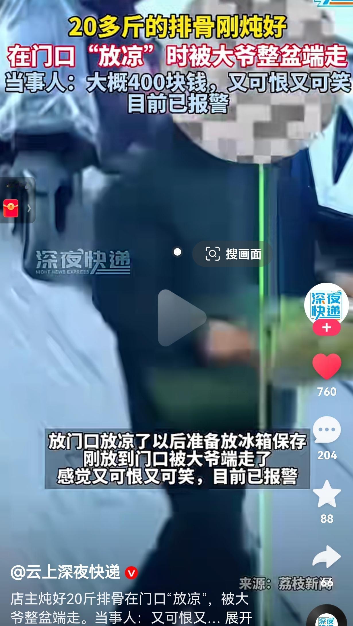 真的是又好笑又好气!辽宁沈阳一家火锅店的老板娘,刚炖好20多斤排骨往门口一放,就被一位大爷连盆端走了,那动作丝滑得跟回家拿自家东西似的,老板娘当场人都傻了! 3月16日,火锅鸡店主的张女士忙活了大半天,进了40斤排骨,用高压锅咕嘟咕嘟炖得软烂入味。 店里当天用不完,剩下20多斤,张女士想着刚出锅的排骨太烫,放门口吹吹凉,回头好端进冰箱存着。 就这短短一会儿的功夫,监控里拍下离谱一幕:一位穿着深色衣服、戴着口罩的大爷慢悠悠走过来,低头瞅了瞅门口的排骨盆,二话不说,弯腰端起就走!那步伐,那神态,完全就是“这排骨归我了”的既视感,连犹豫都不带犹豫的。 张女士回头一看,排骨没了,调监控一看气得浑身发抖。这20多斤排骨,实打实400块钱呢!对于小本生意的火锅店来说,这可不是小数目。 她又气又无奈,说这事儿又可恨又可笑,现在已经报警处理了。 咱说句实在的,谁没个难处?哪怕大爷真穷,真馋这口肉,你敲个门问一句,老板娘能不给你吃吗?可他偏不,非要干这种偷鸡摸狗的事!这哪是拿排骨,这是拿自己的老脸往地上踩! 看看网友的评论,简直说出了所有人的心声,有的网友说:“这大爷是真把“占便宜”刻进DNA里了,20多斤排骨,他是打算炖一锅,还是端回去当传家宝?” 也有的网友说:“我要是老板娘,当场能追三条街!400块钱呢,够买好几斤排骨了,这大爷年纪这么大了,为了一点排骨,老脸都不要了?” 也有的网友说:“最气的不是丢了排骨,是这种明目张胆的偷窃,让人心寒!以后谁还敢把东西放门口?” 还有的网友说:“别找借口,穷不是偷的理由,富也不是贪的资本,人品这东西,真的跟年龄没多大关系!” 咱们常说“远亲不如近邻”,可现在有些人的良心,真的没有多少。一把年纪了,活了大半辈子,连最基本的是非观都没有?偷一碗排骨事小,丢了做人的底线事大! 咱们再往深了想,这事儿折射出的是什么?是部分人骨子里的冷漠和贪念。总有人觉得“不就是一点东西吗”,总想着占小便宜,却忘了“勿以恶小而为之”的道理。 400块钱,可能也就是一顿饭钱而已,也可能是老板娘一天的辛苦钱。你贪图一时口腹之欲,毁掉的是自己的人品,也寒了别人的心。 我不是要苛责所有老人,我家里也有老人,我知道大多数老人都淳朴善良、懂得体谅他人。但这种倚老卖老、肆意践踏他人权益的行为,真的让人忍无可忍!做人,最起码的底线是不偷不抢,最起码的良知是尊重他人。 别觉得偷这点东西没人知道,监控拍得清清楚楚;别觉得占这点便宜赚了,失去的人格尊严,多少钱都买不回来。 最后我想对这位大爷说:你端走的是排骨,丢掉的是做人的尊严。也想告诉所有人,别让贪念毁了自己,别让冷漠凉了人心! 这世上最贵的从来不是排骨,是做人的良心,是刻在骨子里的教养! 对此,你怎么看?