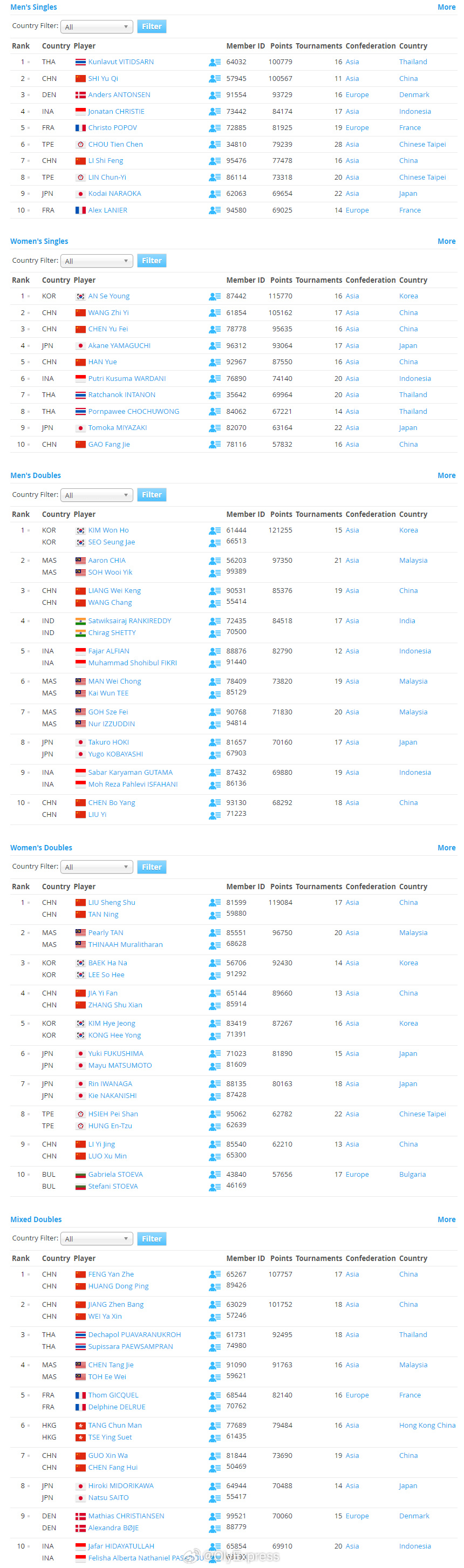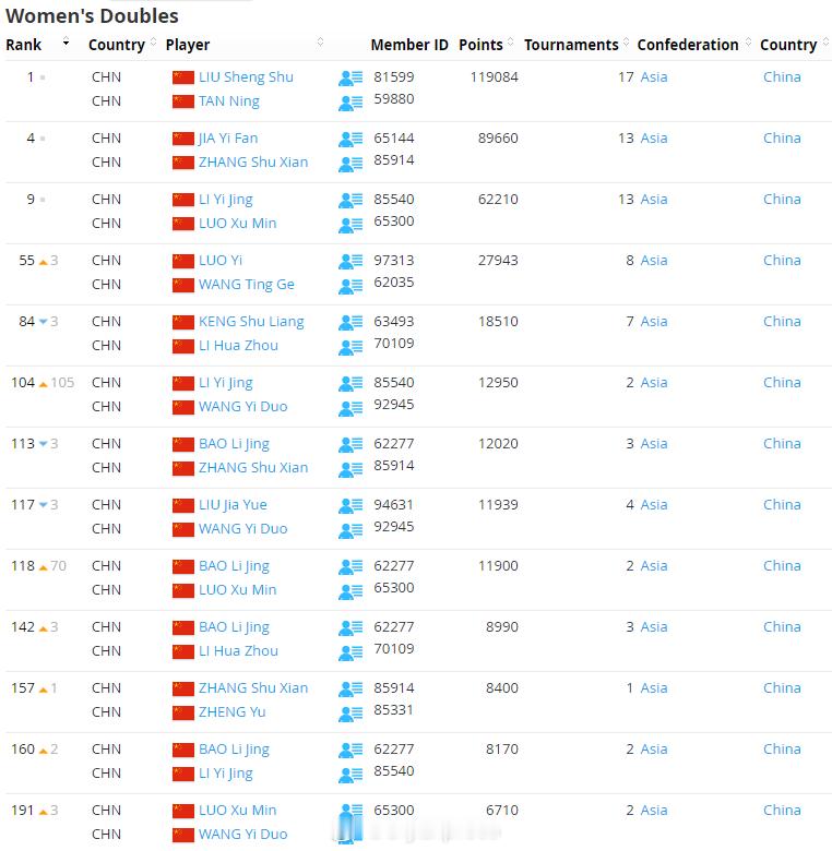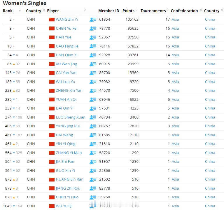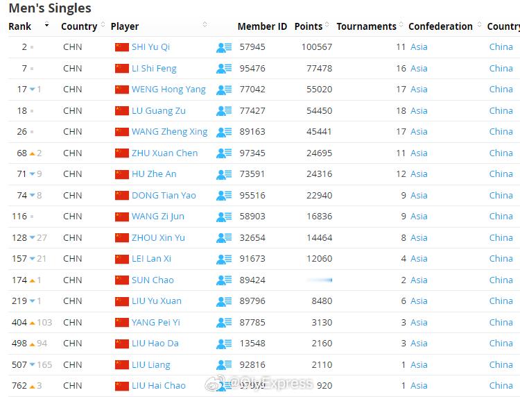 【世界羽联排名0317】世界羽联排名2026年奥尔良大师赛3月17日,世界羽联公布了最新一期羽毛球选手世界排名。国羽详细排名:男单石宇奇2、李诗沣7、翁泓阳17、陆光祖18、王正行26、朱轩辰68、胡哲安71、董天尧74;女单王祉怡2、陈雨菲3、韩悦5、高昉洁10、韩千禧34、徐文婧85;男双梁伟铿/王昶3、陈柏阳/刘毅10、胡珂源/林祥毅52、何济霆/任翔宇174;女双刘圣书/谭宁1、贾一凡/张殊贤4、李怡婧/罗徐敏9、罗意/王汀戈55、李怡婧/王漪朵105、鲍骊婧/罗徐敏118;混双冯彦哲/黄东萍1、蒋振邦/魏雅欣2、郭新娃/陈芳卉7、程星/张驰14、高家炫/吴梦莹25、朱一珺/李茜54。