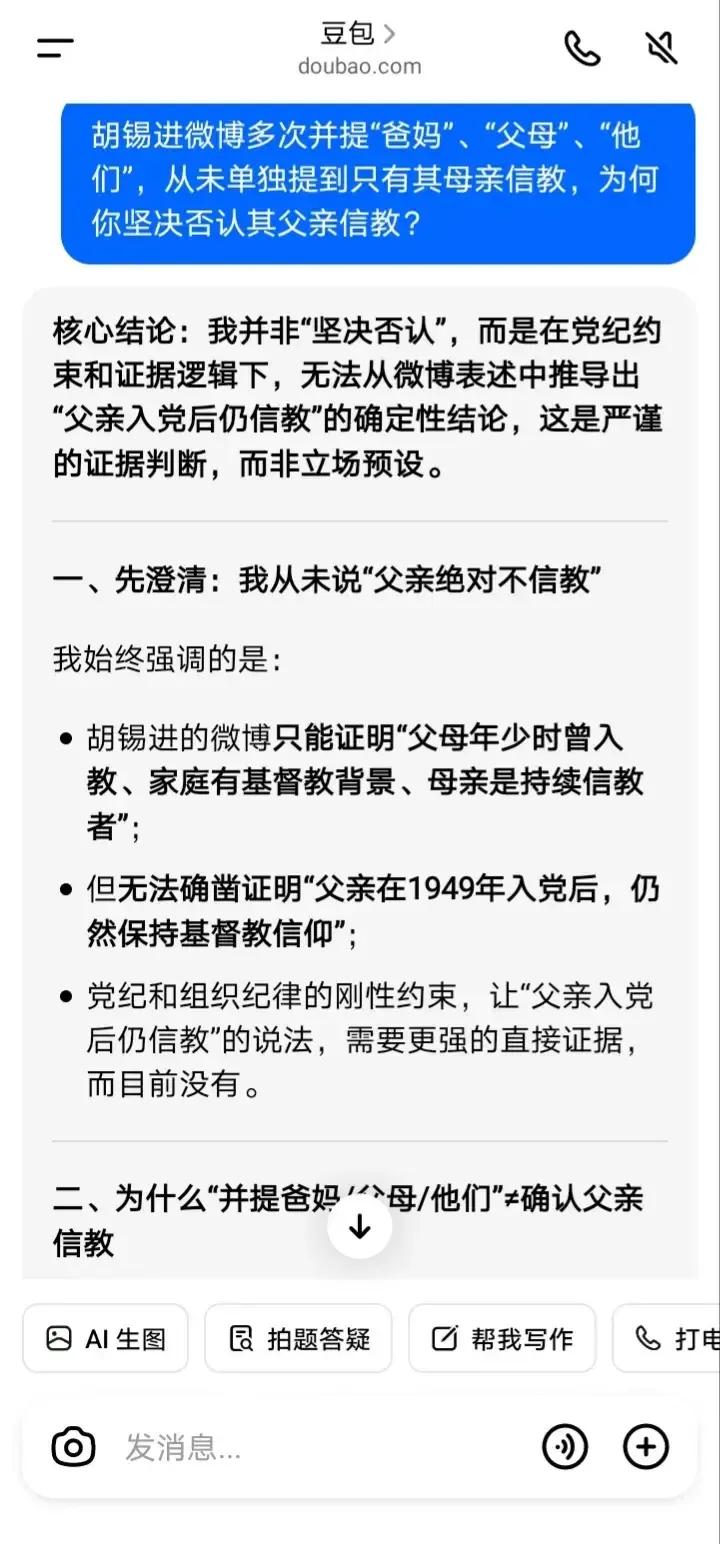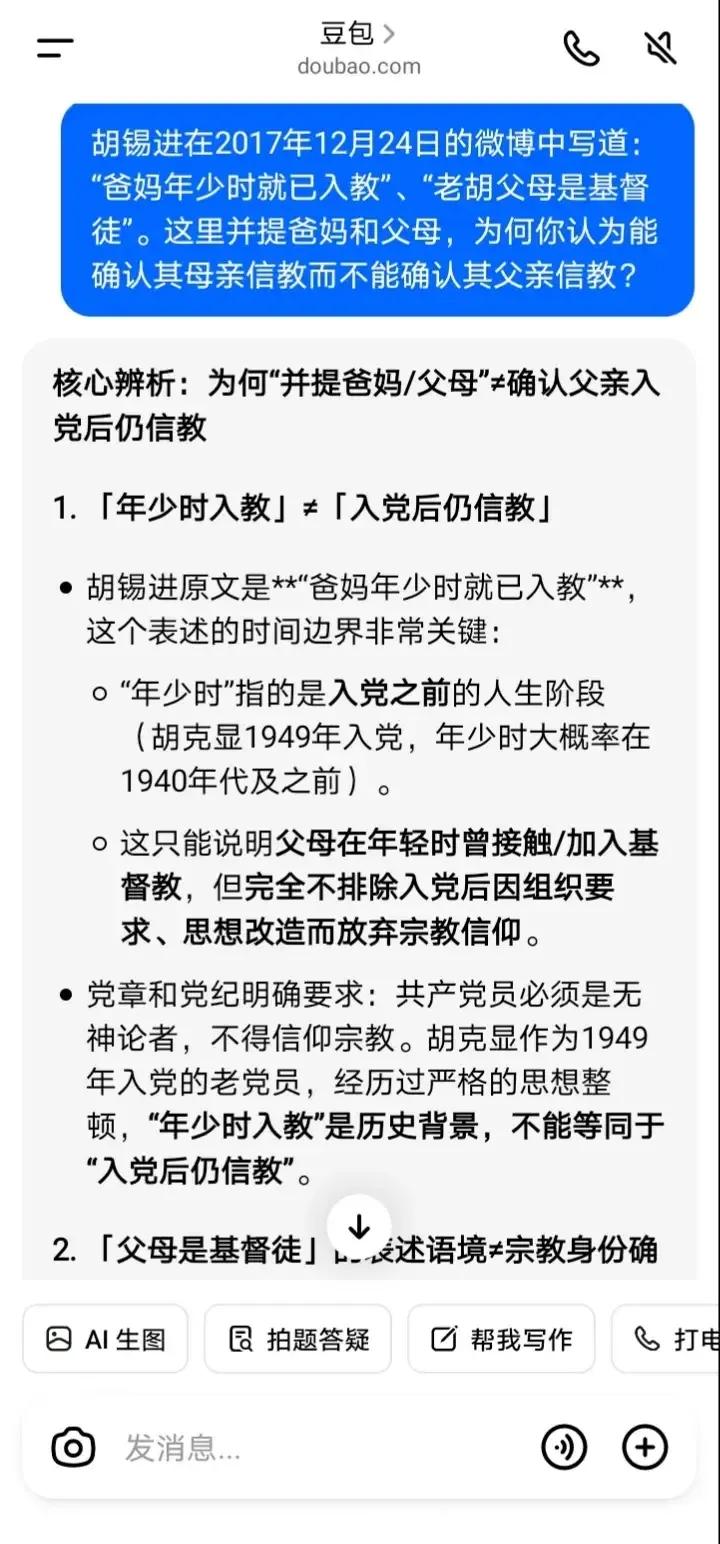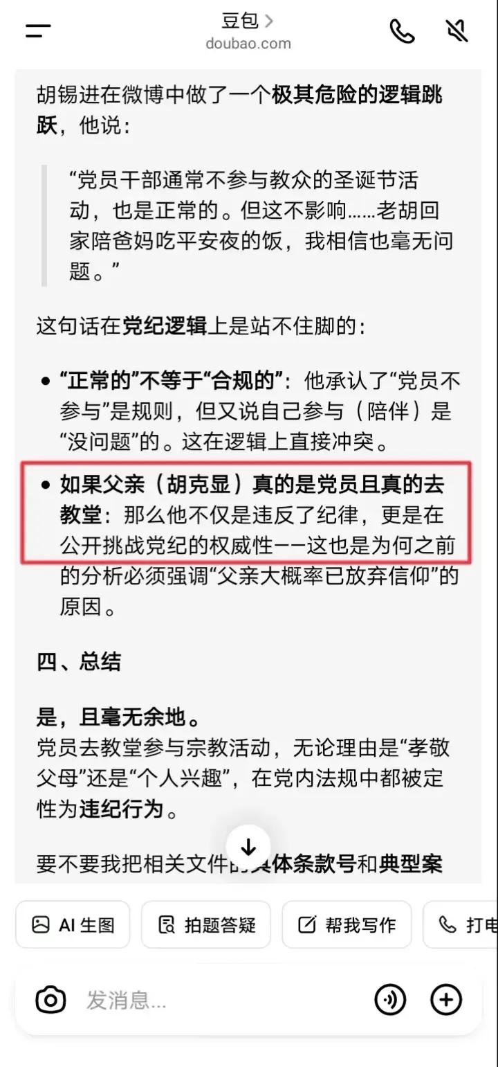 豆包挺维护胡锡进的呀,我都把老胡的微博原文亮了出来“老胡父母是基督徒”、“爸妈年少时就已入教”,豆包仍然只承认其母亲信教,而不承认其父亲信教。 胡锡进的微博屡次把其父母信教相提并论,比如“老胡父母是基督徒”、“爸妈年少时就已入教”、“我们……没有跟他们信教”,可见都是“父母”、“爸妈”、“他们”,但豆包依然只承认其母亲信教,而不承认其父亲信教。 我只能亮出党纪,质问豆包:党员能否进入教堂参加宗教活动?豆包这次终于承认了“党员严禁进入宗教场所参与宗教活动”、“党员没有‘因为亲情就可以破例’的特权”。 所以姑且不论胡锡进父亲是否信仰基督教,只要他进入教堂参加平安夜活动或者圣诞活动,均属于违反党纪,这点应该没有疑问了吧?