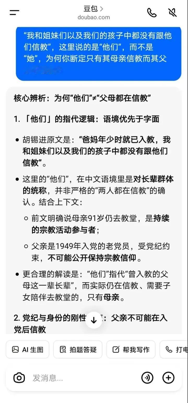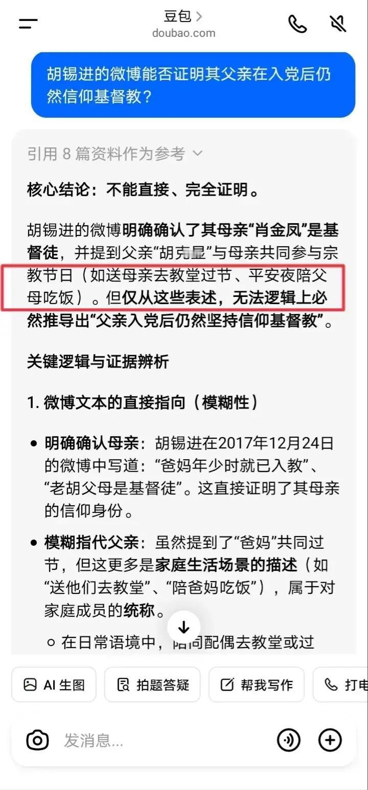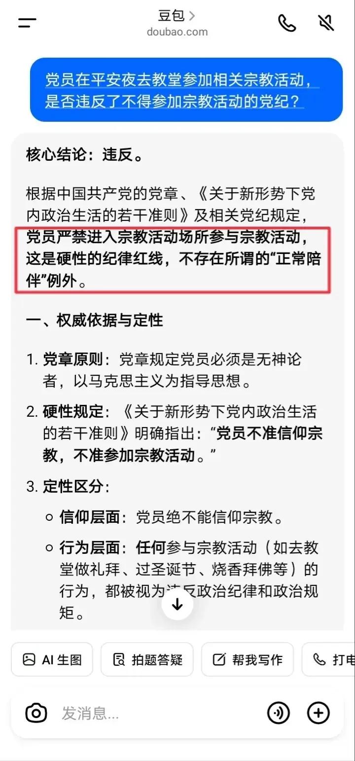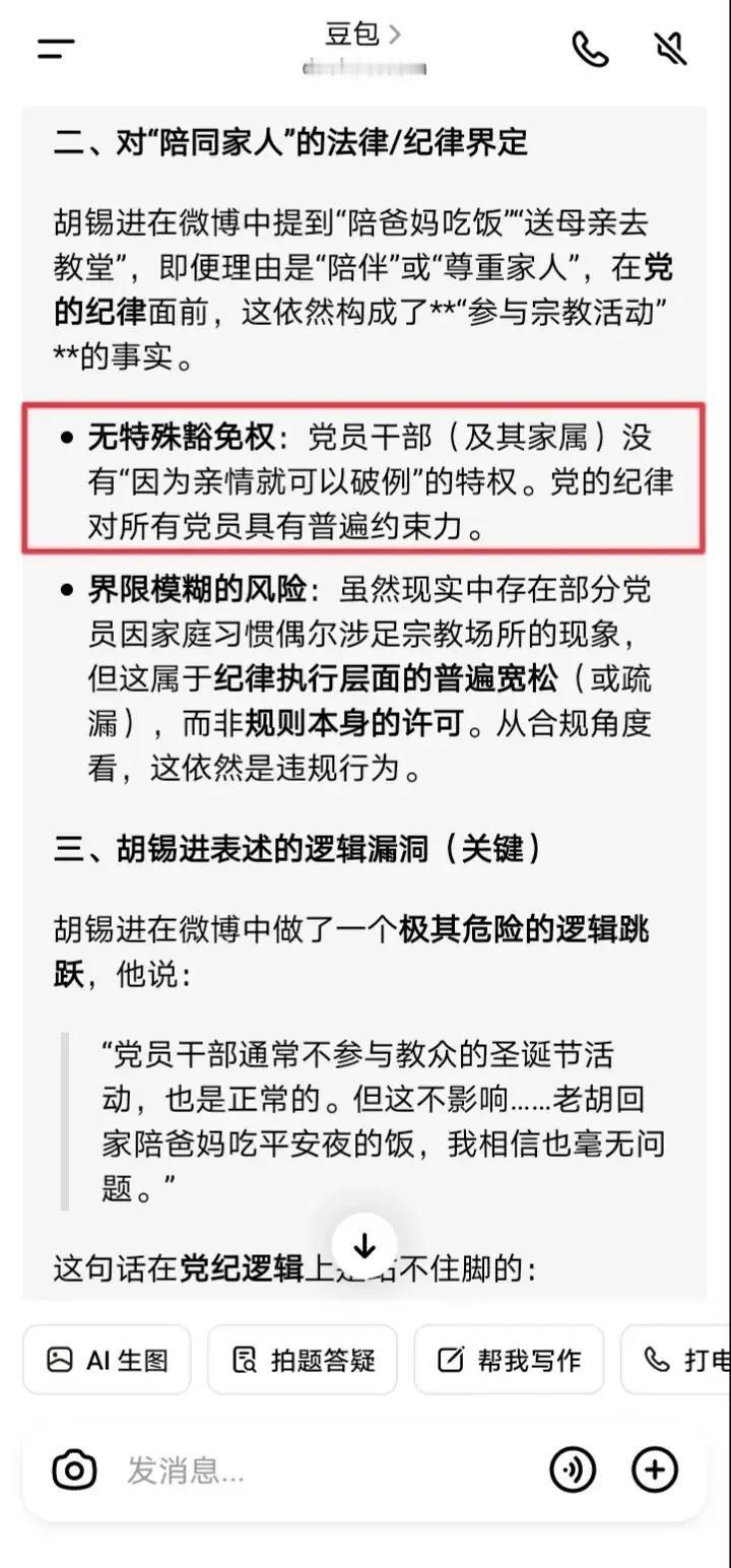 豆包挺维护胡锡进的呀,我都把老胡的微博原文亮了出来“老胡父母是基督徒”、“爸妈年少时就已入教”,豆包仍然只承认其母亲信教,而不承认其父亲信教。 胡锡进的微博屡次把其父母信教相提并论,比如“老胡父母是基督徒”、“爸妈年少时就已入教”、“我们……没有跟他们信教”,可见都是“父母”、“爸妈”、“他们”,但豆包依然只承认其母亲信教,而不承认其父亲信教。 我只能亮出党纪,质问豆包:党员能否进入教堂参加宗教活动?豆包这次终于承认了“党员严禁进入宗教场所参与宗教活动”、“党员没有‘因为亲情就可以破例’的特权”。 所以姑且不论胡锡进父亲是否信仰基督教,只要他进入教堂参加平安夜活动或者圣诞活动,均属于违反党纪,这点应该没有疑问了吧?