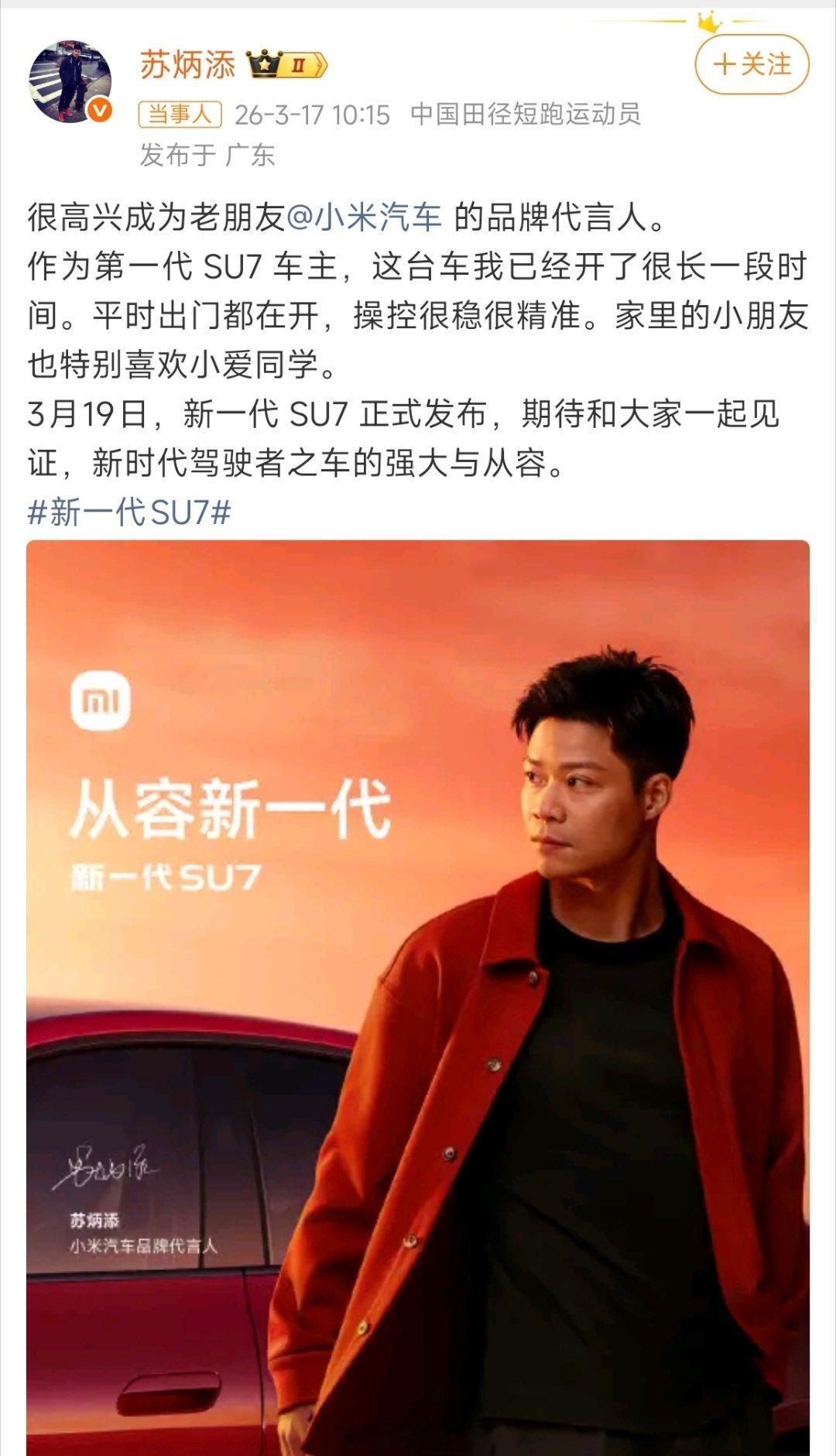苏炳添正式成为小米汽车品牌代言人,雷军给出了三大选择理由:亚洲最快、初代SU7车主、姓氏与SU高度契合,速度与口碑双契合。