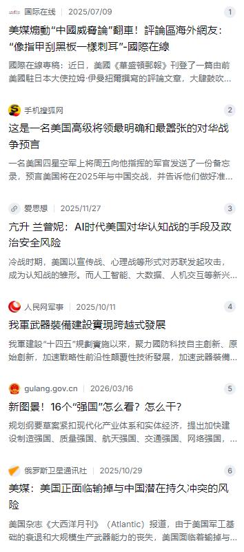 如果不想灭亡,就不要开战!多家美国媒体呼吁中国:一旦中美冲突,中国死路一条。想象一下,2025年中美之间擦枪走火,美国空军高层早就放话,中国会输得很惨。多家美国媒体齐声附和,警告北京别轻举妄动,否则国家灭亡在即。 麻烦看官老爷们右上角点击一下“关注”,既方便您进行讨论和分享,又能给您带来不一样的参与感,感谢您的支持! 最近这两年,尤其是进入2025年以来,不知道大家发现没有,大洋彼岸时不时就吹过来一阵冷风。美国有些空军的高级将领,比如那个叫迈克·米尼汉的空军机动司令部司令,老是板着脸预言,说中美在2025年就会干一仗 。这还没完,他们不光是自己内部开会说说,还故意把这些话捅给媒体,像《华盛顿邮报》这些主流大报也跟着起哄,话里话外就一个意思:中国要是敢动手,那就是死路一条,甚至有人用“国家灭亡”这种耸人听闻的字眼来吓唬人 。 说实话,这种论调咱们听着是不是特别耳熟?这不是他们第一次这么说了,肯定也不是最后一次。咱们得扒开表皮看内里,这哪是什么靠谱的战争预测啊,这分明就是一场精心策划的“舆论战”和“心理战”。你想啊,真正的杀招谁会天天挂在嘴边嚷嚷?他们越是这么大声吆喝,越是暴露了心里的不踏实。美国那帮战略精英现在看着咱们一天天发展起来,心里跟猫抓似的,焦虑得很。以前靠几艘航母、几个军事基地就能唬住人的日子一去不复返了,现在只能靠媒体这张嘴,搞点低成本的语言暴力,试图用这种“狼来了”的方式给咱们制造战略压力,其实这恰恰是他们霸权优势弱化后的一种本能反应 。 面对这种铺天盖地的舆论喧嚣,咱们的心态其实挺稳的。要是搁在几十年前,听到世界第一强国这么叫板,可能还真得掂量掂量,晚上都睡不着觉。但现在不一样了,咱们早就过了那个别人一瞪眼就心慌的阶段。国家这些年干的都是实事儿,埋头搞发展,心无旁骛。你美媒喊你的,我发展我的。不管外面的风浪多大,咱们始终保持着清醒的战略定力,绝对不会被这种极端的对抗情绪带偏了节奏。说白了,咱们有自己的节奏,有自己的蓝图,犯不着别人敲几下锣鼓,咱们就乱了舞步。 咱们这份底气到底是从哪儿来的?当然不是靠嘴皮子吹出来的,那是几十年如一日自主创新,真金白银砸出来,大国重器造出来的。别的咱不说,就看看2025年的现实情况,海军福建舰那边,歼-15T、歼-35这些新型舰载机早就完成了电磁弹射起飞,这意味着咱们的航母作战群正在形成实实在在的战斗力 。再看看阅兵场上那一排排没见过的家伙什,从“东风-61”这类陆基洲际导弹,到那些科幻感十足的无人机、机器狼作战单元,全都是国产的,而且成体系地列装 。有了这些家底,外头的那些舆论恐吓自然就失了效,就像你手里有了一堵厚厚的墙,蚊子再嗡嗡叫,也就是那么回事儿,叮不透。 更有意思的是,美国的媒体也不全是铁板一块,有时候他们自己人说的话也挺打脸的。就在那些鹰派将军叫嚣着要打仗的时候,也有美国杂志像《大西洋月刊》站出来泼冷水,说美国现在的军工基础衰退得厉害,大规模生产武器弹药的能力早就跟不上了,真要是和中国陷入持久冲突,输的那个指不定是谁呢 。为啥会有这种声音?因为数据不会骗人,中国制造业的体量和完整性摆在那,真要拼消耗、拼工业潜力,那个所谓的“世界警察”心里其实没底。 回过头来看,中国应对这种外部威胁最有效的办法,其实就是咱们眼下正在做的事:集中精力办好自己的事情。不管外面怎么吵吵,咱们始终把经济建设、科技创新、国防现代化这些硬指标摆在第一位 。你打你的舆论战,我筑我的复兴基。历史早已证明,一个国家的崛起绝不是靠别人的施舍,也不是靠几句嘴仗就能被打断的。那些关于“灭亡”的聒噪,终究会成为大国博弈背景里的一点杂音,而中国发展的坚实步伐,是谁也拦不住的。
