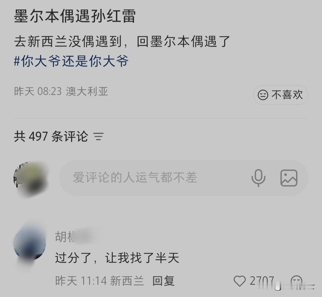 网友发图说在墨尔本遇到了孙红雷,老子找了半天都没找到! 图里一共也就六七个人,一眼就能看全,我翻来覆去看了好几遍,还在树林子里看了老半天,就是找不到。 好嘛,我以为就我看不见呢,看了评论区才发现,有人和我一样找不到。 这网友太过分了,孙红雷看到这个图文,估计要气的脸发绿了。