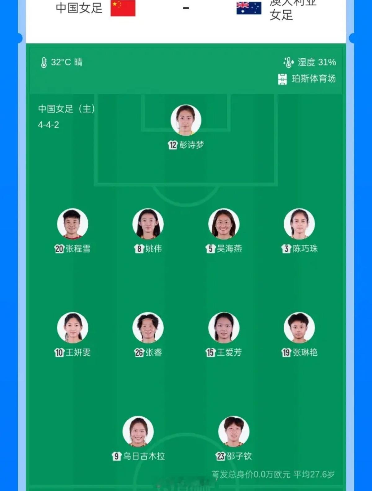 中国女足 /中国女足vs澳大利亚女足中国女足半决赛首发 12-彭诗梦、3-陈巧珠、20-张程雪、5-吴海燕、8-姚伟、26-张睿、15-王爱芳、19-张琳艳、9-乌日古木拉、10-王妍雯、23-邵子钦王霜停赛缺战
