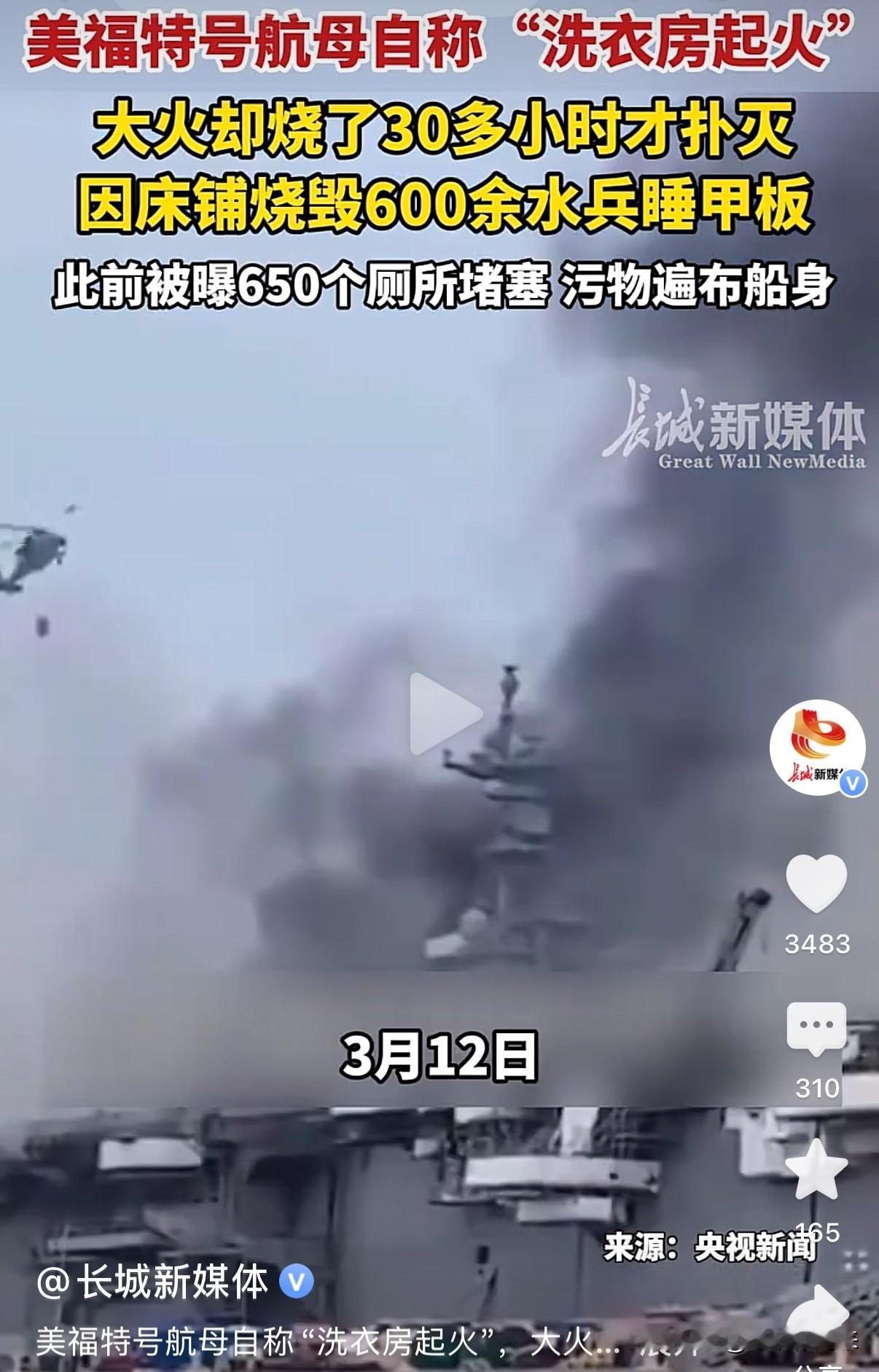福特号航母火情之大,连卫星都拍到了! 美国媒体终于承认了,福特号航母上的大火烧了30个小时! 不过却强调,不是因为被袭击,而是因为洗衣房起火! 据资料显示,“福特”号航母是美国“福特”级航母是美国第三代的核动力航母,它是首舰! 2017才年正式服役!它可是美国最先进的航母! 距离上次“厕所堵塞”事件才多久啊?现在又发生火灾,而且在洗衣房起火?舰上那么多官兵日夜守着,能让大火烧起来,还烧了30多小时,导致600多水兵无处可睡,并因此伤了两位士兵?实在是太蹊跷! 更为蹊跷的是,该舰正在红海执行对伊朗的军事行动,伊朗宣称要对航母进行打击,这时候发生了大火,火情大的连卫星都拍到了,美军相关人士却刻意隐瞒,实在令人费解![捂脸][捂脸][捂脸]