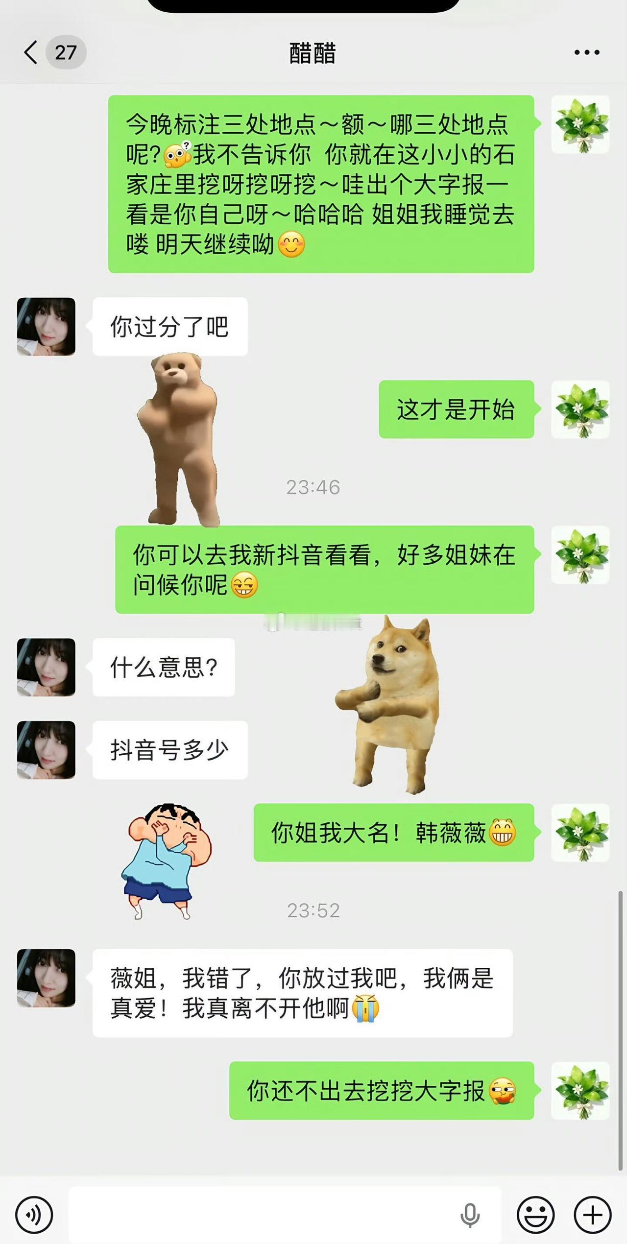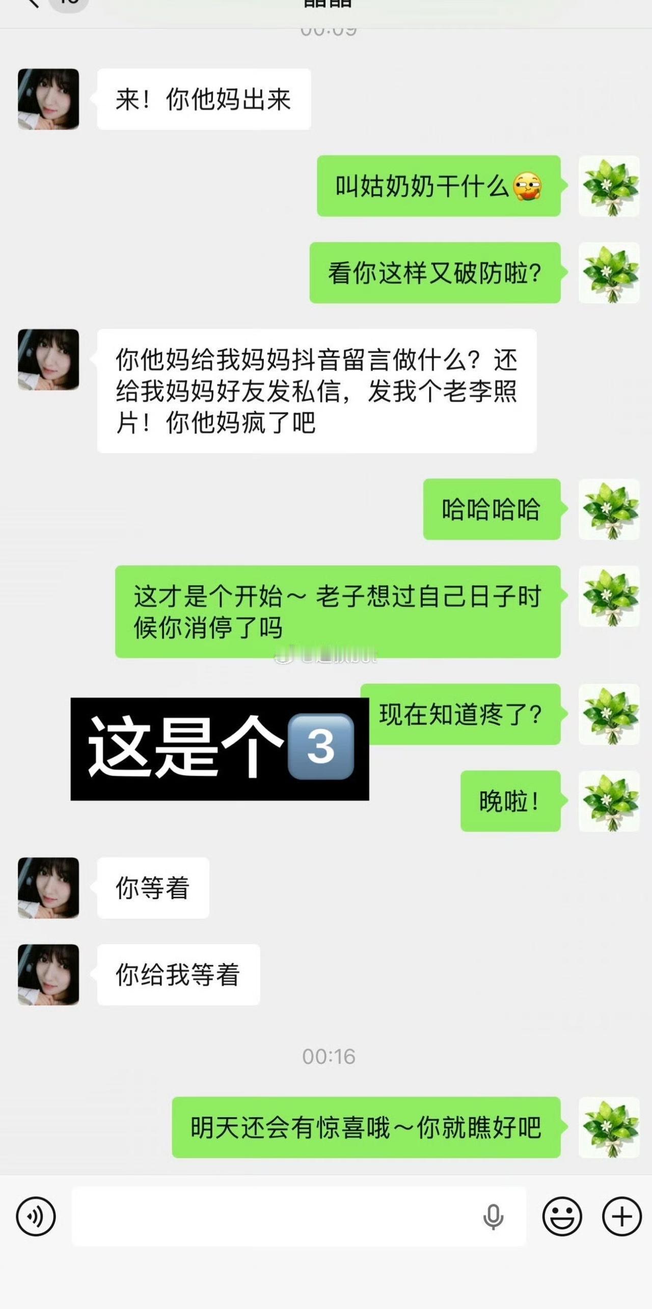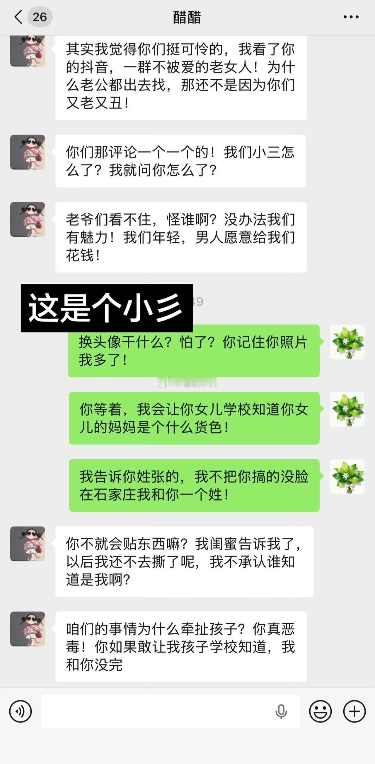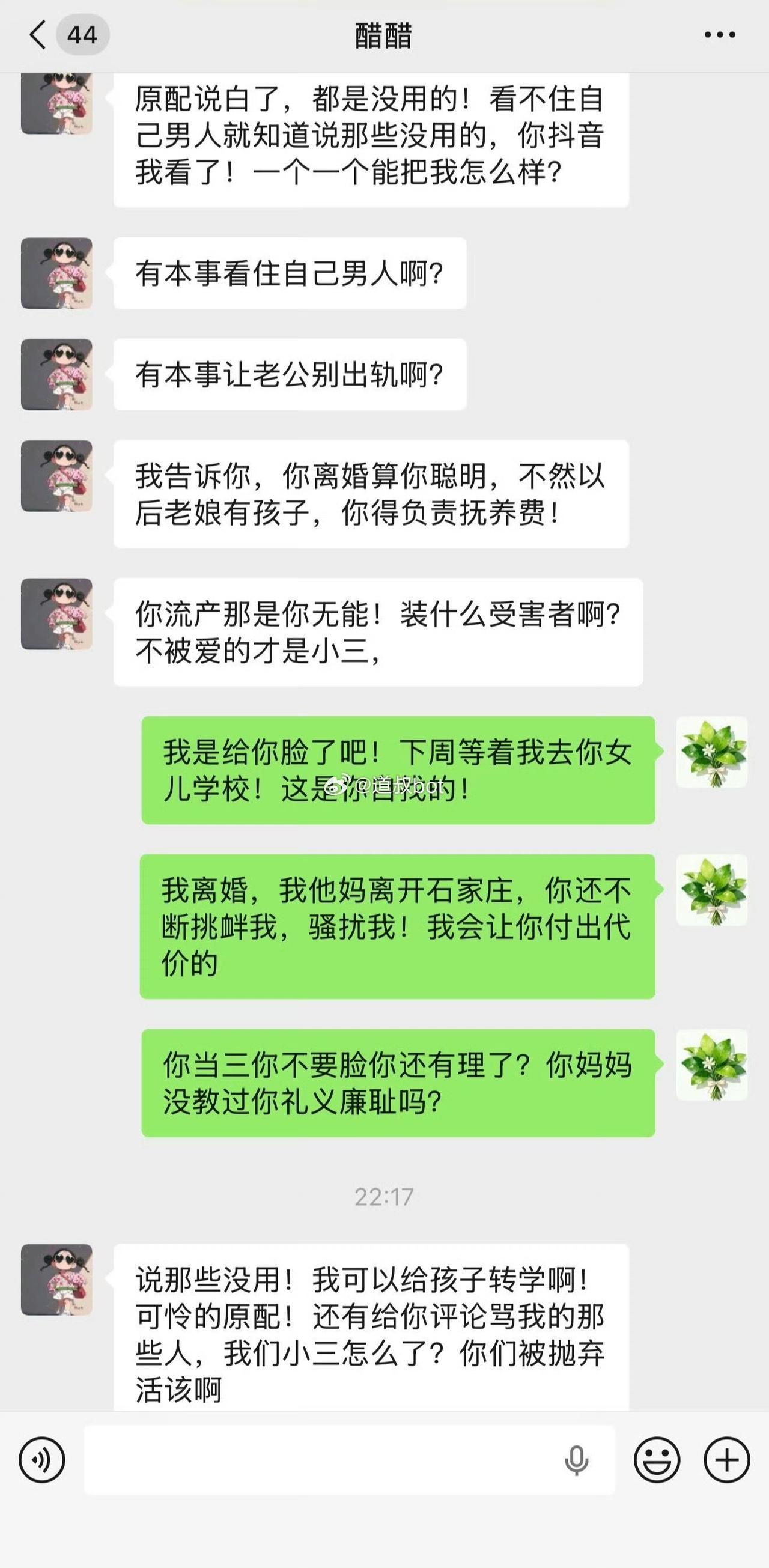 河北石家庄一女子爆料自己被小三疯狂挑衅,怀孕 6 个月的孩子因情绪激动大出血流产。女子和小三微信里面的聊天记录,显示小三非常的高调嚣张,直接指出原配不配得到老公的爱,希望她离开。现在真的是倒反天罡,原配要低调做人,小三趾高气扬,公序良俗何在。就问老公在后面干什么?既不制止小三,也不维护自己的老婆,置身事外吗?