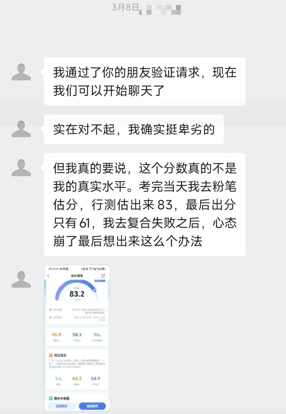 值得注意的是,在李明将事件经过发布到社交平台后,有自称该岗位笔试第四名的网友留言,称自己也曾收到过“第一名”发送的虚假成绩。李明推测,对方的目的是排除所有潜在竞争对手——按照考试规则,在面试资格审查环节,若前三名中有考生放弃面试,第四名可递补入围,“这不仅是品行不端,也破坏了公平竞争的环境”。