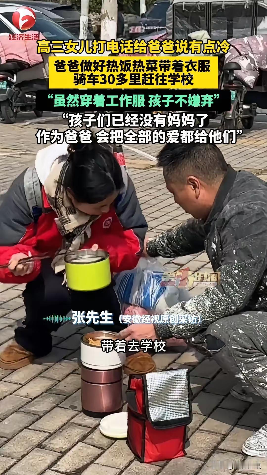 绷不住了!安徽一位高三女儿,晚自习前给爸爸打了个电话,轻轻说了一句:“爸,我有点冷。”就这一句话,单亲爸爸张先生瞬间坐不住了。 妻子离世多年,他一个人既当爹又当妈,女儿懂事从不喊苦,一旦开口,一定是撑不住了。 ​​他翻出厚衣服,又赶紧做了女儿最爱吃的热饭,骑着车,顶着冷风赶了30多公里路。自己冻得手脚发麻,却只想让女儿早点穿上暖衣、吃上热饭。 “爸,我有点冷”——女儿一句话,父亲在寒风中狂奔30公里。那身沾满灰的工作服,是中国式父亲最笔挺的西装。 这无声的父爱太戳心了!工装沾灰却爱意滚烫,三十公里的奔赴全是最深的牵挂❤️相依为命的父女,女儿有个顶天立地的好父亲!底层老百姓生活不易,善待! 网友表示:这位父亲的表现我很有触动,八十年代初,我的女儿读高一,每天晚上要到校上晚自习,有天晚上突然下暴雨,我丝毫没犹豫,披上雨衣拿起雨伞就往学校跑,我站在校院里暴雨下一直等到女儿下课,当女儿撑着雨伞进到家门后,一把拉着我的手,激动的对我说,爸,你送的这把雨是我学习的动力,女儿也没辜老爸的爱心,她从高一到高三,一直是班里前十名,高考成绩竟名列学校高考生成绩的第五名,被一所重点高校彔取,她的同级同学现在是央视的新闻播音员。 世界上最美的父亲,有担当有责任,希望全中国男人都要像这位对家庭负责任的爸爸学习学习。