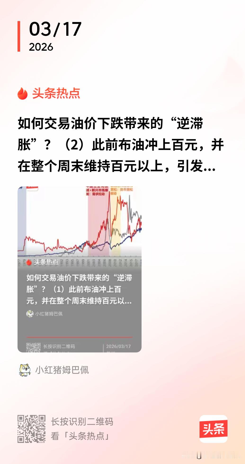 如何交易油价下跌带来的“逆滞胀”?(3) 此前布油冲上百元,并在整个周末维持百元以上,引发全球对于经济滞胀的担忧。从我的角度来看,虽然我说了“地缘政治无专家”,冲突走向无法预测。但是结合多方的利益和宏观经济的角度考虑,我认为油价难以长期维持在百元以上,随着冲突的持续或进一步烈度下降,我先看布油回到80-85元区间进行交易。 那么,如果我这个预判是对的,当下对于资产担忧“滞胀”的交易是有些过度了,我们普通投资者如何把握“逆滞胀”交易呢,也就是参与油价可能从100逐步下跌的交易呢?我用几条来和大家说说逻辑和道理。 3、固定收益资产(美债、中资美元债等) 逻辑:油价回落 → 通胀预期下降 → 实际利率预期下行 → 债券价格上涨。 重点关注:美国10年期国债(若收益率回落至4.0%以下) 投资级信用债;中资高评级美元债(受全球流动性改善带动) 当前美债收益率约4.22%(写稿时间),若油价中枢下移至80美元以下,有望进一步下行。