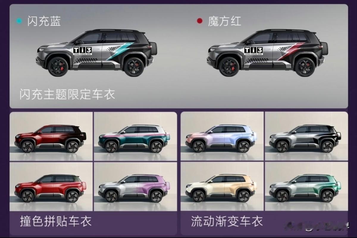 集十大黑科技于一身,方程豹 钛3 科技含量拉满! 随着方程豹 钛3闪充版正式发布,15万价位A级方盒子纯电SUV市场开始热闹起来了,比亚迪将首款搭载第二代刀片电池及闪充技术的车型给了方程豹,说明钛3这款车必定拥有掀翻同级市场的硬实力,用黑科技打造豹力新体验。 大家都知道,比亚迪最新发布的第二代刀片电池+闪充技术实现新能源汽车的快速补能,做到了油电同速,常温下从10%到70%只需要5分钟,从10%到97%只需要9分钟,零下30℃低温补能所需时间只比常温多3分钟。这一次技术体验毫无保留的给了钛3闪充版,并且起售价仅15.38万元,首任车主享18个月免费闪充权益。 除了二代刀片电池及闪充技术,钛3 还拥有智能EVO+平台、天神之眼、主动预瞄+云撵-C、方程豹专属AI智能座舱、钛7同款智慧生态、iTAC智能扭矩控制系统、TSC高速爆胎辅助控制系统、CTB整车安全架构等十大黑科技。 方程豹钛3在外观设计上依旧走的是英朗的方盒子路线,却采用了大胆的星际战车设计,拥有6大外观色+3大内饰色;3套前脸+18套潮改车衣+7套轻潮流改方案,专为年轻人打造多元化的个性需求。 潮流的外观之下,钛3也“内有乾坤”,通过独特科技外观、多样座舱功能打造了独有的星际座舱,为车主及家人带来了贴心前舱+舒享座舱+便携后舱新体验。 方程豹钛3闪充版不只是一款满足日常通勤工具,它更代表的是一种生活方式,用科技及智能打造属于车主的第二空间。