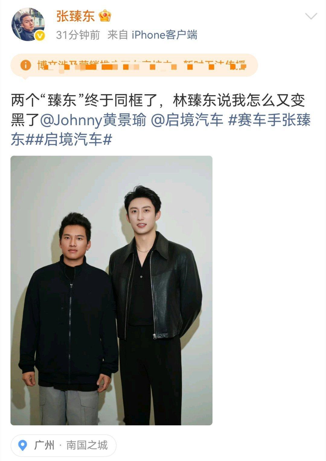 黄景瑜︱启境发布会︱后台合影20260317焦急等待的间歇已经有发布会嘉宾迫不及待晒出自己和【林臻东】的合影了!这位车手也叫臻东!今晚的代言人造型好帅啊!