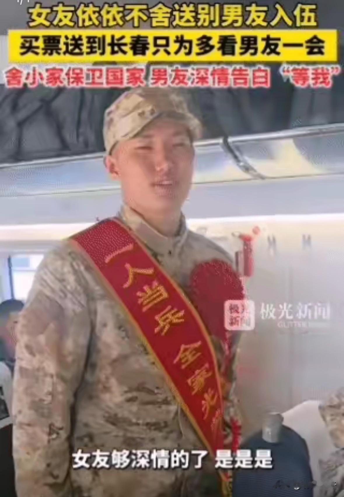 太甜了!黑龙江哈尔滨,一男生参军入伍,没想到,自己女友为了送他,竟然也买了一张到长春的票,其目的只是为了多看男友一会,而女友那害羞的一幕,不得不让人说一句:“太甜了!” 这名男生叫王宇,是哈尔滨一所二本院校的大三学生,女友陈悦是同校的学妹,两人是在校园社团活动中相识的。 王宇从小就有军旅梦,爷爷曾是老兵,家里的军功章和旧军装一直是他的宝贝,高考时他本想直接入伍,却被家人劝着先完成学业,直到2026年上半年征兵报名开启,他再也按捺不住心里的念头,第一时间报了名。陈悦知道他的梦想,没有半分犹豫,只是红着眼眶说,我等你,你放心去。 两人的恋爱没有轰轰烈烈的桥段,全是校园里的细碎温暖。 王宇会早起给陈悦带热乎的豆浆油条,会在她熬夜赶论文时默默泡好咖啡,会陪着她逛中央大街,把冻梨塞到她手里,也会在她生理期时揉着她的小腹说,以后我去当兵,你要照顾好自己。陈悦会给王宇织围巾,会把他的军装照片设成手机壁纸,会在他备考征兵体检时每天发消息叮嘱,这些细碎的美好,成了两人支撑彼此的底气。 征兵体检和政审都顺利通过,王宇拿到入伍通知书那天,两人坐在松花江畔的长椅上,沉默了很久。 王宇反复说,最多两年,我就回来,到时候娶你。陈悦点点头,把脸埋进他的怀里,没说一句挽留的话,只是悄悄攥紧了他的衣角。她知道,穿上军装就意味着责任,她不能拖他的后腿,只能把所有的不舍都藏在心里。 3月16日清晨,哈尔滨火车站人头攒动,新兵们身着迷彩服,胸前戴着大红花,胸前的绶带写着“一人当兵,全家光荣”。 王宇和家人拥抱后,转身走向检票口,陈悦跟在后面,脚步放得极轻,生怕多走一步就要面对真正的离别。她早就查好了列车时刻表,王宇乘坐的新兵专列会在长春中转,她咬咬牙,买了一张到长春的硬座票,她只想多看他一会,多陪他走一段路,哪怕只是几个小时的车程。 检票口前,王宇回头看她,眼里满是心疼。他知道她平时连坐火车都怕,更何况是为了送他,特意绕路到长春。 陈悦别过脸,不敢看他的眼睛,手指绞着衣角,脸颊微微泛红,那是害羞,也是不舍。她把一个装着亲手做的酱牛肉和煮鸡蛋的保温袋塞到他手里,又把一瓶温热的奶茶塞进他的迷彩服口袋,声音小得像蚊子哼:“路上吃,别饿着。” 列车缓缓驶入站台,新兵们有序上车,王宇被战友簇拥着走向车厢,陈悦跟在后面,一步一步,直到列车员拦住她,她才停下脚步。 她站在站台边,看着王宇从车窗里探出头,朝她挥手,他的眼眶红了,却强忍着没掉泪。陈悦也笑着挥手,直到列车启动,她才慢慢转身,却又突然想起什么,快步跑到列车旁,对着车窗喊:“王宇,等我!” 王宇在车厢里大声回应:“等我回来给你一个家!” 这一幕被同行的战友用手机拍了下来,又被传到了网上,极光新闻记录下了这段画面,配文“女友买票送长春,只为多看男友一会”,瞬间暖了全网。 网友们纷纷留言,有人说这是爱情最好的样子,有人说军恋的坚守最动人,还有当过兵的网友分享自己的经历,说自己入伍时,女友也是这样送他,现在两人已经结婚,孩子都会跑了。 陈悦坐在前往长春的列车上,手里攥着那张到长春的车票,脸上还带着害羞的红晕,嘴角却一直扬着。她给王宇发了一条消息:“我到长春了,你在部队要好好的,我等你回来。”王宇很快回复:“我会好好的,你也要照顾好自己,别总熬夜,别总吃零食。” 列车到长春站时,陈悦没有下车,而是直接买了返程票,她只是想陪王宇坐一段路,想多看看他的样子,想把他的身影刻在心里。她知道,这趟列车载着的不仅是她的思念,更是他的家国情怀,她的等待,是对他最坚定的支持。 王宇到部队后,给陈悦写了第一封信,信里说,他在部队学会了叠豆腐块,学会了站军姿,学会了扛枪,他说,等他立功,就把喜报寄给她。 陈悦把信压在枕头下,每天都会拿出来读一遍,她会给王宇寄去自己织的袜子,会寄去家乡的粘豆包,会在信里写校园里的趣事,写她每天的生活,让他知道,他不在的日子里,她也在好好生活,也在好好等他。 身边的同学和朋友都羡慕陈悦,说她的爱情纯粹又坚定。陈悦却说,不是爱情甜,是王宇值得,是这份坚守值得。她见过太多人因为异地分开,却从未想过和王宇分开,她知道,他去守护的是国家,她守护的是他,这是他们之间最特别的约定。 事件发酵后,更多人开始关注军恋这个群体。军恋从来不是说说而已,是一次次的等待,是一封封的书信,是隔着屏幕的思念,是隔着山海的坚守。 那些看似简单的“等我”,背后是无数个日夜的牵挂,是无数个平凡日子的坚守。王宇和陈悦的故事,只是万千军恋中的一个缩影,却让所有人看到了青春最美的模样:有人舍小家为大家,奔赴军营;有人守着小家,等待归人。 各位读者你们怎么看?欢迎在评论区讨论。