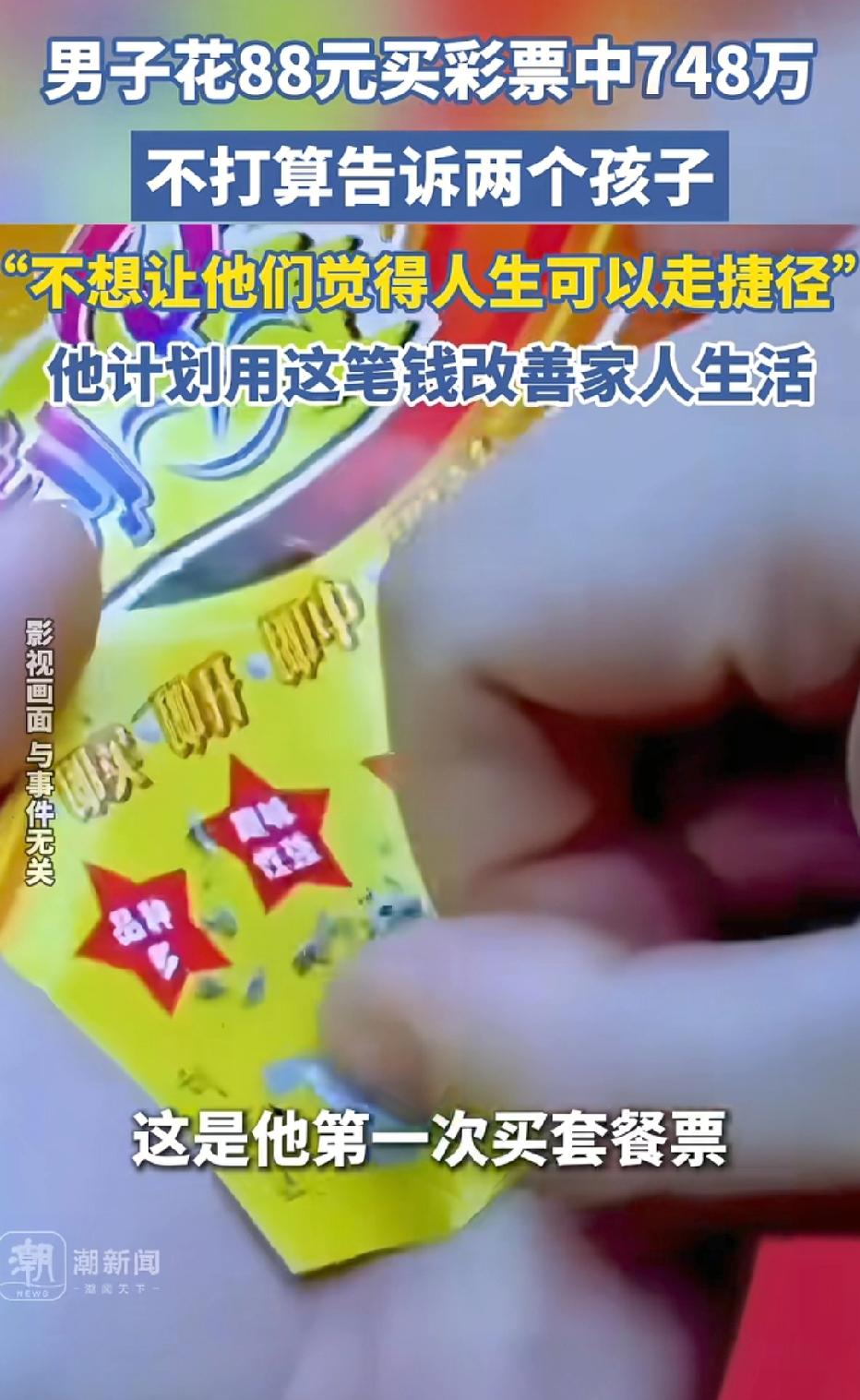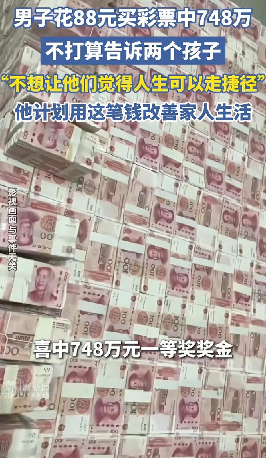泼天富贵!浙江绍兴,男子花88元买彩票,不料,却意外中了748万大奖,但他却不打算告诉家里的两个儿子。男子称,不想让他们觉得人生可以走捷径,他们通过努力得到想要的生活。网友怒赞:这才是真的富养! 谁能想到,一笔从天而降的泼天富贵,就这样砸在了吴先生的头上。 3月16日,吴先生只是路过彩票店,这是他人生第一次买彩票,心里也没多想,就花了88块钱买了一张大乐透套餐票。 买完他自己都没当回事,随手一塞,该上班上班,该过日子过日子,完全没把中奖这件事放在心上。 他一直觉得彩票中大奖概率极低,压根没想着暴富。能中个小奖就当运气好,不中也无所谓,就当随便玩玩、体验一下。 直到开奖那天晚上,吴先生闲着没事拿出手机一对号码,一对不要紧,整个人直接僵住了。 他瞪大眼睛,一遍又一遍地核对,前区、后区,一个数字一个数字对照,心脏“咚咚咚”快要跳出胸口。 当确认自己真的中了748万大奖时,吴先生再也绷不住了! 他当场激动得跳了起来,欣喜若狂,手舞足蹈,在屋里来回转圈,嘴里不停地念叨:“中了!我中了!真的中了!” 他这样的情况就和范进中举没啥两样。 长这么大,他从来没见过这么多钱,一瞬间,喜悦像洪水一样把他整个人淹没,激动得差点喊出声。 他第一时间跑去找妻子,把这个天大的好消息告诉了她。 夫妻俩关起门,你看着我、我看着你,脸上全是藏不住的惊喜和激动,半天都缓不过来。 748万,对一个普通家庭来说,简直是想都不敢想的数字,这笔钱足以让一家人的生活彻底翻身。 冷静下来之后,夫妻俩开始商量这笔钱怎么用。 吴先生明确说,奖金主要就两个用途:第一改善家里生活,把日子过得舒服一点;第二全部用在孩子教育上,给孩子更好的学习条件、更好的成长环境。 可说到孩子,夫妻俩却同时做出了一个让人意外的决定,暂时不告诉两个儿子! 原来,家里有一个孩子正在读初中,正是三观成型的关键时期,心思敏感,也最容易受外界影响。 吴先生和妻子都担心,一旦孩子知道家里突然中了几百万大奖,心态很容易就飘了。 他们怕孩子觉得:反正家里有钱了,读书不用那么拼了,努力也没意义了,人生可以直接走捷径。 更怕孩子变得好吃懒做、贪图享受,小小年纪就失去奋斗的动力,一辈子靠着这笔钱浑浑噩噩过日子。 吴先生说:“钱是我中的,不是他们挣的。他们想要的生活,必须靠自己努力去赚。” 妻子也完全赞同丈夫的想法,夫妻俩一拍即合,决定把这个秘密先藏在心里,继续像平常一样生活,不让孩子有半点不劳而获的念头。 明明手握几百万大奖,却依旧保持平常心。明明可以让孩子立刻过上“富二代”的生活,却选择守住秘密,让他们脚踏实地。 网友们知道后纷纷怒赞:这才是最清醒的父母!这才是真正的富养! 有钱不炫,有福不张扬,比起给孩子留下一笔巨款,他们更愿意留给孩子自立、自强、肯努力的好品格。 吴先生这波操作,真的赢麻了! 吴先生中奖后第一时间告诉妻子完全合情合理。 《民法典》第1062条规定:夫妻在婚姻关系存续期间所得的生产、经营、投资的收益,为夫妻共同财产,归夫妻共同所有。 吴先生中奖后第一时间告诉妻子、共同商量怎么用,既合法,也符合法律精神。 如果他故意瞒着妻子单独处置,反而会侵犯配偶的知情权和财产权,甚至在离婚时面临财产少分或不分的风险 。 吴先生选择和妻子坦诚沟通,既守住了法律底线,也是夫妻之间的信任与尊重。 吴先生担心孩子三观受影响、想走捷径,选择不告诉,行为也是合法。 对此,你怎么看?