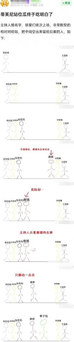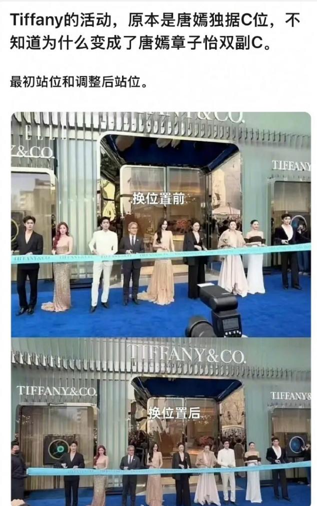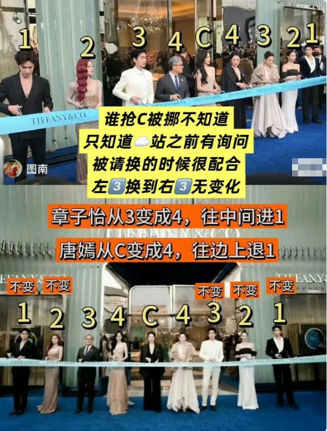 粉丝又因为蒂芙尼明星站位吵翻天了! 蒂芙尼前几天在北京三里屯举办了线下开幕活动,内娱所有代言人到场,品牌方安排的上台顺序是品牌大使王星越,李昀锐,宋雨琦和钟楚曦,四人上台后主动靠两遍站,随后叫了品牌代言人张若昀和唐嫣,但是唐嫣没有主动靠边站,而是和张若昀站一起了,最后叫了全球代言章子怡,章子怡人还挺好的,明知道自己肯定是C位,但还是没有插空到唐嫣和张若昀中间,而是主动去了唐嫣留出的空间,所以唐嫣站了C位,粉丝通稿说唐嫣C位,但是被网友质疑抢了章子怡C位,最终的结果是三家混战,张若昀也被骂了,还有说他抢C的,但是按照过往品牌站位来看,唐嫣应该和张若昀一样主动站品牌方外面,但是唐嫣站了男高管的位置,和章子怡成了副C,导致女品牌方主C,男品牌方无C,这次钟楚曦躲过一劫,此前VOGUE活动和金鸡奖,钟楚曦都因为陷入抢C争议被骂很惨,唐嫣也不是第一次陷入抢C风波,之前星光大赏也不顾地面上写好的名字,堂而皇之站错过位置。