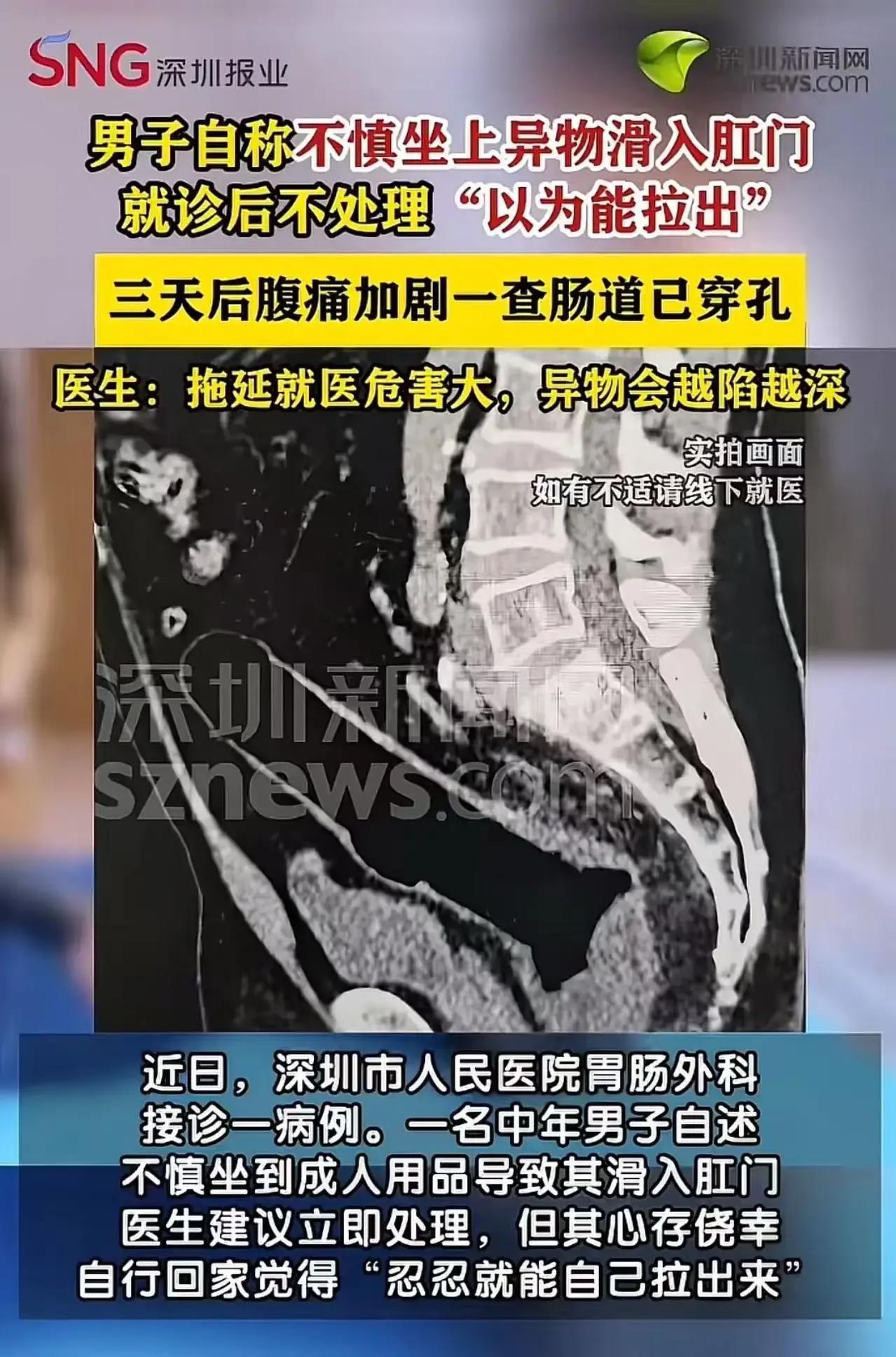 “节操碎了一地!”这可不是什么网络段子,而是真实发生在广东深圳的一起离奇事件。一名中年男子竟然因为坐上了成人用品,导致其滑入肛门,这究竟是怎么回事呢? 据这名男子自述,他在不慎坐上成人用品后,该物品竟然意外滑入了肛门。由于羞于启齿,他硬扛了整整3天,没有及时就医。然而,这三天里,他的身体状况却越来越差,最终引发了肠道穿孔的严重后果。这一事件被曝光后,立刻引发了网友们的热议。有网友表示难以置信,质疑这是否是真实发生的事情,甚至调侃道:“光屁股摔的吗?这么精准的进去了?”但事实上,这起事件确实给我们敲响了警钟。成人用品虽然能给人带来愉悦,但使用不当却可能带来严重的后果。我们在享受科技带来的便利时,更要注意安全,切勿因一时的疏忽而酿成大祸。 这起事件虽然离奇,但却给我们带来了深刻的反思。安全无小事,无论何时何地,我们都要时刻保持警惕。对于这起事件,你有什么看法呢?快来评论区留言讨论吧!尿事件 人间奇葩事件