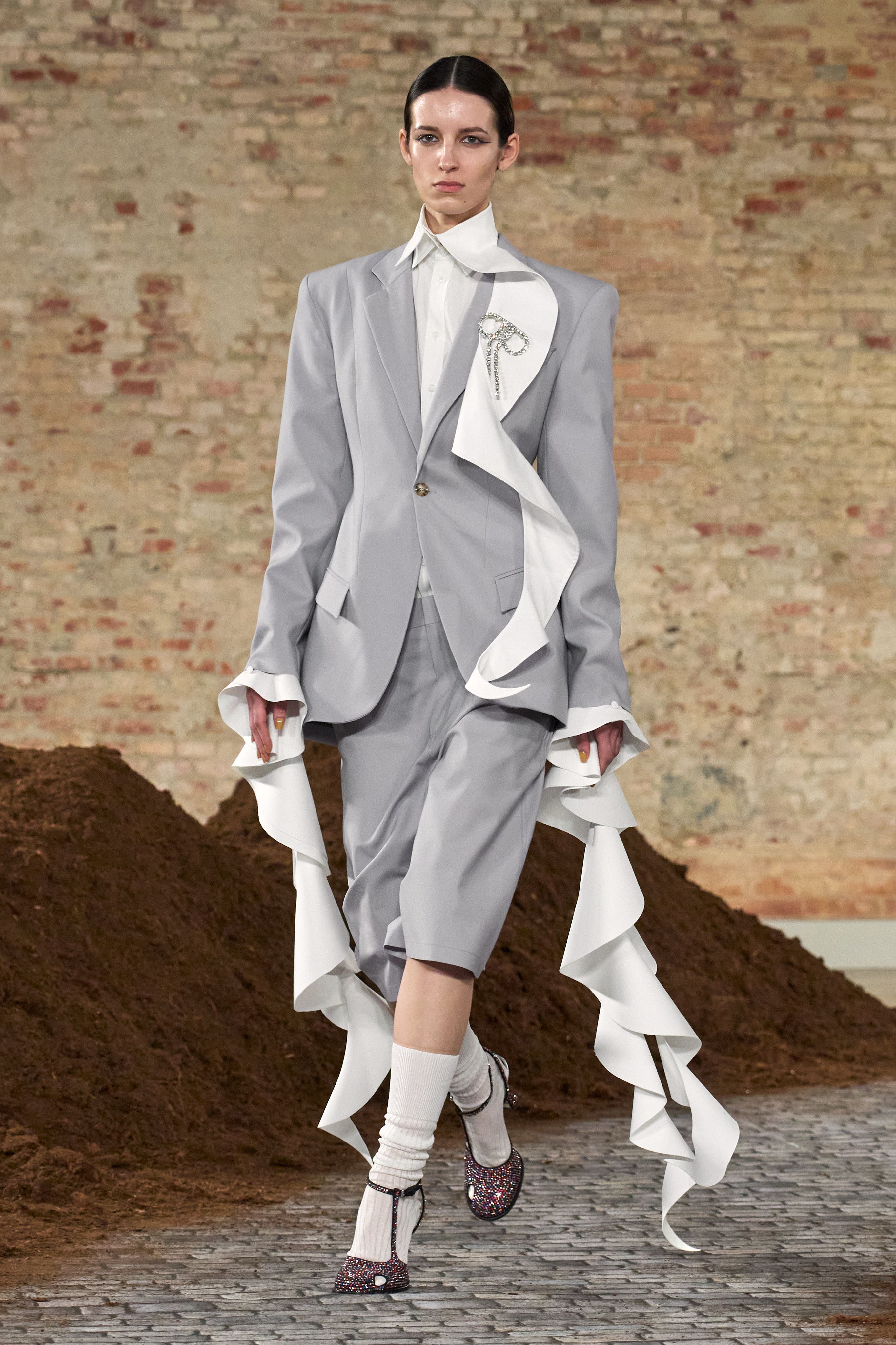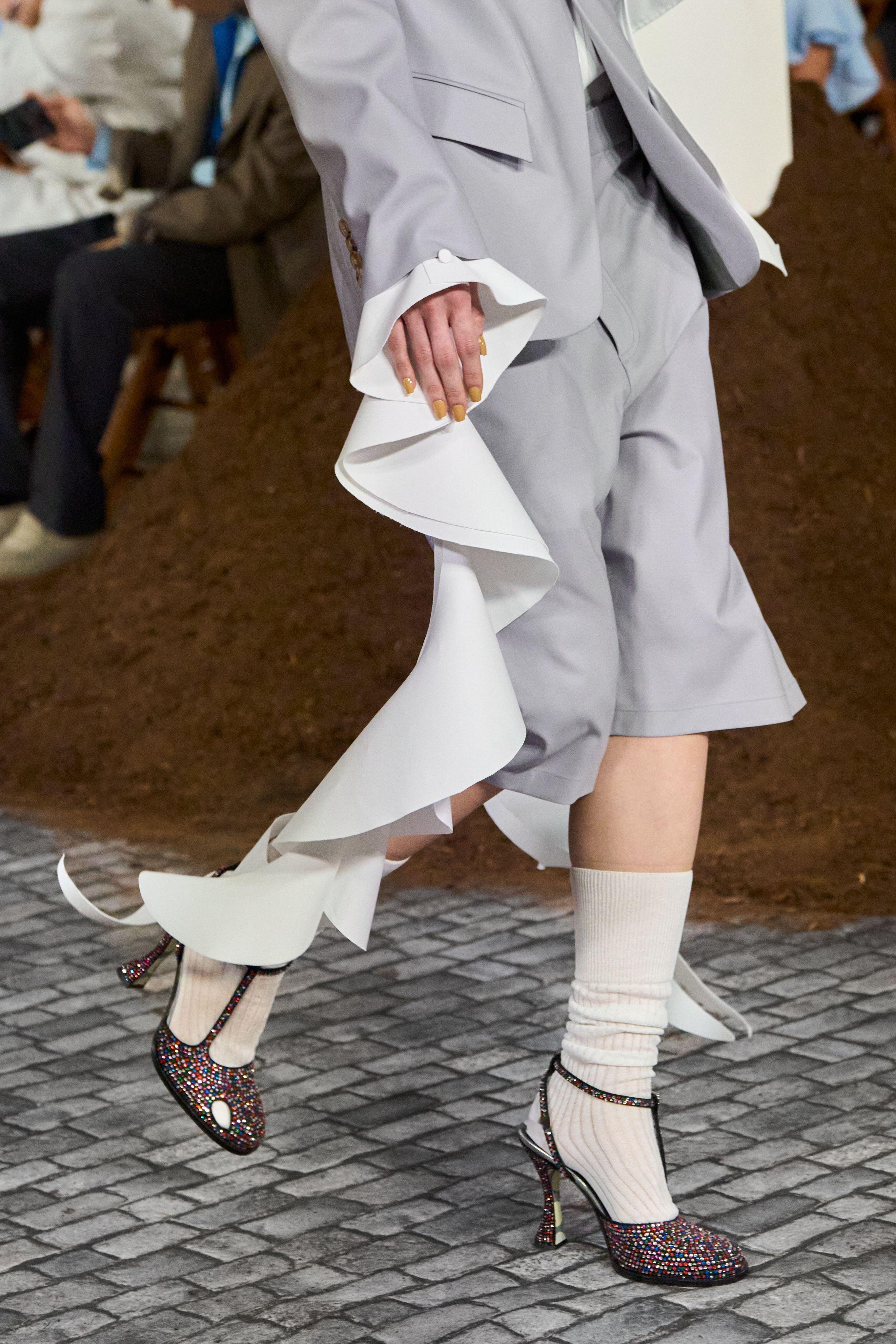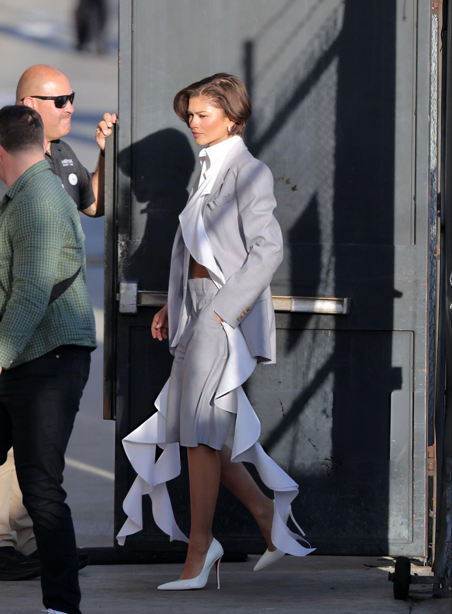这套Look做了减法,把拉低质感的钻饰去掉,衬衣不必扣满,只系上两颗纽扣,恰到好处的露肤度,搭配CL白色细跟高跟鞋,单手插兜,松弛潇洒🤍