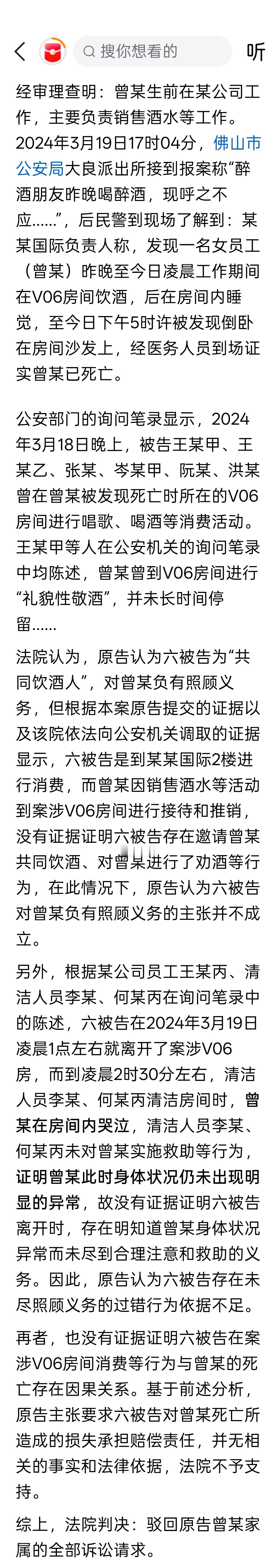 KTV女员工饮酒后在包房死亡,家属起诉6名共饮男子索赔35万,法院驳回:6人离开