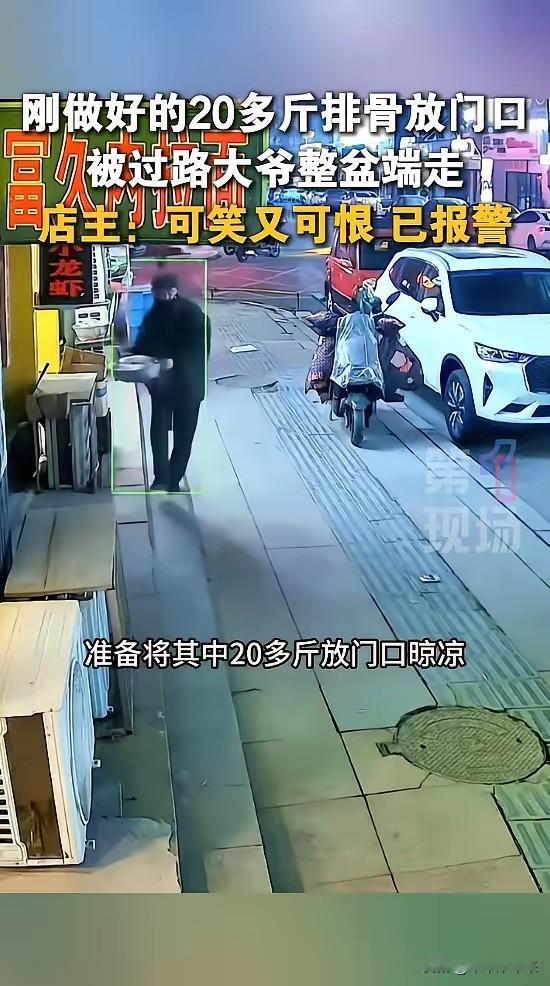 沈阳一火锅店20多斤排骨被大爷端走,店主又气又笑已报警 3月16日,辽宁沈阳一家火锅店门口,上演了一出让人又气又笑的闹剧。 店主张女士当天用高压锅炖了整整40斤排骨,炖好后还剩下20多斤。刚出锅的排骨太烫,直接放进冰箱不仅容易损坏电器,还不利于食材保鲜,张女士便把这一大盆排骨端到店门口,想着借着室外温度晾一晾,再收进冰箱。 放好排骨后,张女士转身回店里忙活其他事,前后不过几分钟,等她再走出店门时,眼前的景象让她愣住了——那盆20多斤的排骨,连盆带肉全都没了踪影。 张女士赶紧调取店门口的监控,画面里的一幕让她哭笑不得。一位头发花白的大爷路过店门口,看到门口的排骨盆后,先是停下脚步打量了两秒,见店里没人注意门口,直接弯腰端起盆,转身就走。整个动作行云流水,没有丝毫犹豫,仿佛这盆排骨是他自家的东西,拿得理所当然。 20多斤排骨不算小数目,光是食材成本就有上百元,平白被人拿走,张女士心里又气又憋屈。她琢磨着跟大爷理论,可监控里只拍到了大爷的背影,看不清具体样貌,只能先选择报警,希望警方能帮忙找到这位大爷,挽回一部分损失。 这件事被分享到网上后,很快引发网友热议。不少网友表示,这种放在店门口的东西也敢顺手牵走,实在是没一点边界感。还有网友说,不是所有放在外面的东西都是“无主之物”,占这种小便宜,说到底是丢了人品。 其实类似的事在生活里并不少见。不少街边小店、餐饮店,偶尔会把刚出锅的食物、待晾干的食材放在门口,或是暂时放些待取的物品,却总有人抱着“不拿白不拿”的心态,趁人不备顺手拿走。 从常理来说,门口的物品即便无人看管,也属于他人的私有财物,并非随手可得的“福利”。占这种小便宜,看似是捡了便宜,实则是在透支自己的信誉。而像张女士这样的店主,遇到这种事除了生气,也只能通过报警、调监控的方式维权,过程里的无奈和憋屈,也让不少人感同身受。 目前警方已经介入调查,正在根据监控线索寻找这位大爷。至于后续能否找回损失,只能等待警方的调查结果。