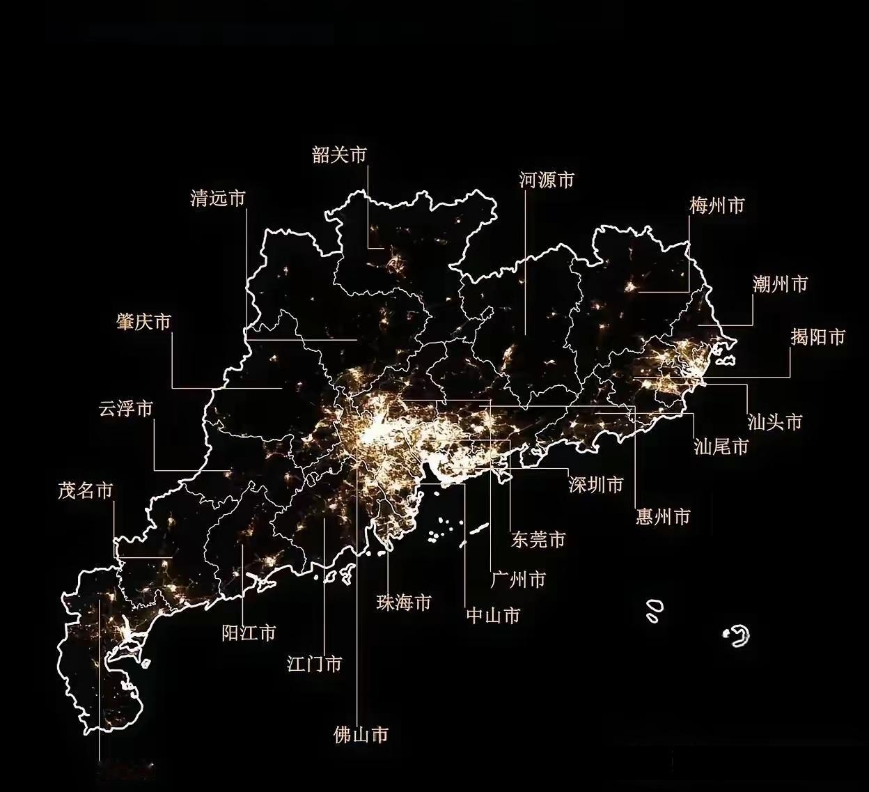 来看看广东20个县级市,城市路灯网的公里数,最长与最短的数据! 粤西地区湛江的廉江市有462.77公里长的公路装了路灯的! 而粤北地区韶关的乐昌市只有44公里的公路装有路灯的。 虽然廉江通路灯公里数是广东县级市排第一,但路灯数最多的并不是廉江,而是粤东地区揭阳的普宁市,有10多万盏路灯,这样的数据,应该是广东省各地区夜间电力灯光图效果图,粤东比粤西地区电力灯光效果图更亮的主因!