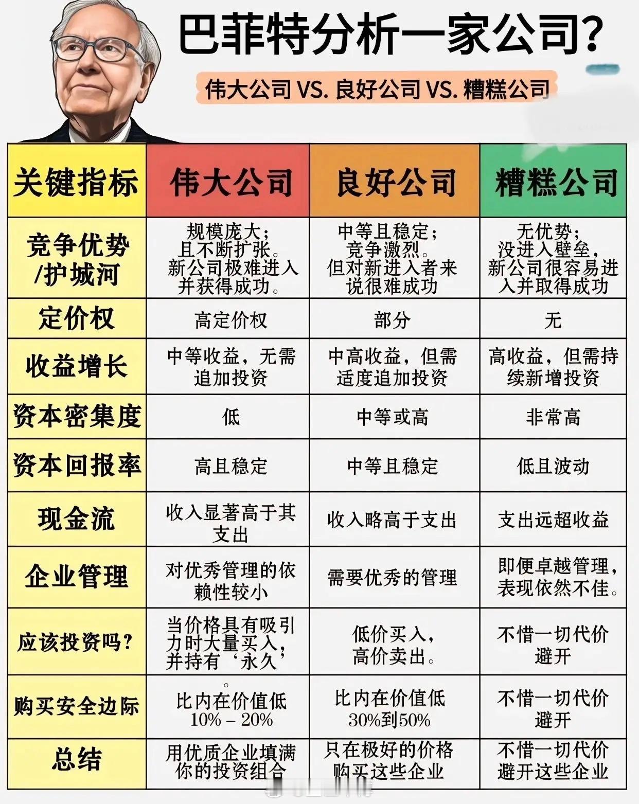 巴菲特曾说:“投资是一场对认知的变现。” 这张图堪称价值投资的“选股教科书”,把企业分为伟大、良好、糟糕三类,核心指标对比一目了然,帮我们避开90%的坑!