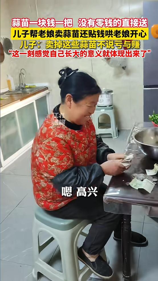 “这儿子没白养!”近日,安徽蚌埠,一老人自己种的蒜苗卖不出去,让儿子处理掉,儿子把蒜苗拉到街上来卖,一块钱一把,没有零钱的直接送,一会就把蒜苗卖完了,最后自己倒贴200凑给母亲,见母亲开心的样子,他觉得十分值得!网友:最甜的“反哺”! 最近安徽蚌埠的一件小事,没上什么大热搜,却暖到了不少人,也让网友们吵了起来。 事情很简单,就是一位老人种的蒜苗卖不出去,急得发愁,就让儿子帮忙处理,儿子的做法,有人夸有人说,到底是怎么回事,咱们慢慢说。 这位老人今年65岁,一辈子勤勤恳恳,闲不住,去年冬天琢磨着种点蒜苗,就拾掇了一亩多地,每天天不亮就去地里浇水、施肥、除草,把蒜苗伺候得水灵灵的。 眼瞅着开春蒜苗能收了,老人心里挺高兴,可没想到,今年收菜的贩子没来,一地里的蒜苗卖不出去,堆在家里没人要。 老人看着自己辛辛苦苦种出来的蒜苗,急得坐立不安,整天唉声叹气,实在没办法,就把儿子叫了过来,让他把这些蒜苗处理掉,别浪费了。 儿子看母亲愁眉苦脸的,心里也不好受,没多说一句废话,直接把车里的东西清空,割了一车蒜苗,拉着就往市区赶。 到了市区,他没找正规的菜市场,就在路边找了个显眼的地方,把蒜苗往地上一铺,扯着嗓子喊了一句,说这是自己老娘种的,种多了卖不出去,老人在家愁得慌,一块钱一把,大家自己拿,要是没带零钱,直接拿走就行,不用给钱。 他这话一喊,路过的人都被打动了,觉得这儿子实在,也心疼老人的辛苦。 有人停下来扫码付款,有人掏出现金扔在旁边,也有确实没带零钱的,道声谢就拿起一把蒜苗走了,儿子就在旁边坐着,不记账、不点数,谁拿都行,脸上也没半点不耐烦。 没多大一会儿,一车蒜苗就卖完了,儿子算了算,一共就卖了107块钱。他没告诉母亲实际卖了多少,自己掏出200块钱,凑成307块,回家递给了母亲。老人拿着钱,笑得合不拢嘴,脸上的愁云一下子就散了。 儿子看着母亲开心的样子,心里也暖暖的,他说,卖掉这些蒜苗不说亏与赚,这一刻感觉自己长大的意义就体现出来了。 这事传到网上后,网友们的看法分成了两派。 有网友说,这才是最甜的反哺,小时候母亲含辛茹苦养我们,长大了我们能哄母亲开心,比给多少补品、多少红包都强,这样的儿子才没白养。 可也有网友不认同,说这样做有点没必要,倒贴钱哄老人,有点刻意,老人本来只是想处理掉蒜苗,不是图那点钱,这样反而显得不真实。 其实说到底,这事没什么对错,农村的老人,一辈子和土地打交道,不是缺那点卖蒜苗的钱,而是怕自己的辛苦白费,怕自己没用,成了儿女的负担。 这个儿子没劝母亲别折腾,也没嫌麻烦,而是顺着母亲的心意,用最简单、最实在的方式,让母亲觉得自己的劳动有价值,让母亲开心。 孝顺从来都不是什么惊天动地的大事,也不是花多少钱、买多少东西,而是懂老人的心,在他们需要的时候,搭把手、尽份力。 这个儿子做到了,他倒贴的不是200块钱,是对母亲的心疼和牵挂,母亲开心的也不是拿到了307块钱,是看到儿子的孝心。 一件不起眼的小事,藏着最朴素的亲情,没有华丽的辞藻,没有刻意的表演,却让人心里暖暖的。 对此您有什么不同的看法,可以在评论区留言讨论!!! 信息来源:《蒜苗一块钱一把,没有零钱的直接送,儿子帮老娘卖蒜苗还贴钱哄老娘开心,儿子:卖掉这些蒜苗不说亏与赚,这一刻感觉自己长大的意义就体现出来了》江北融媒