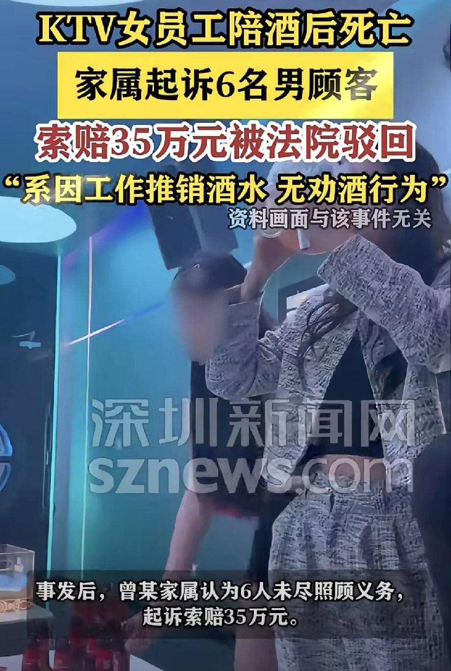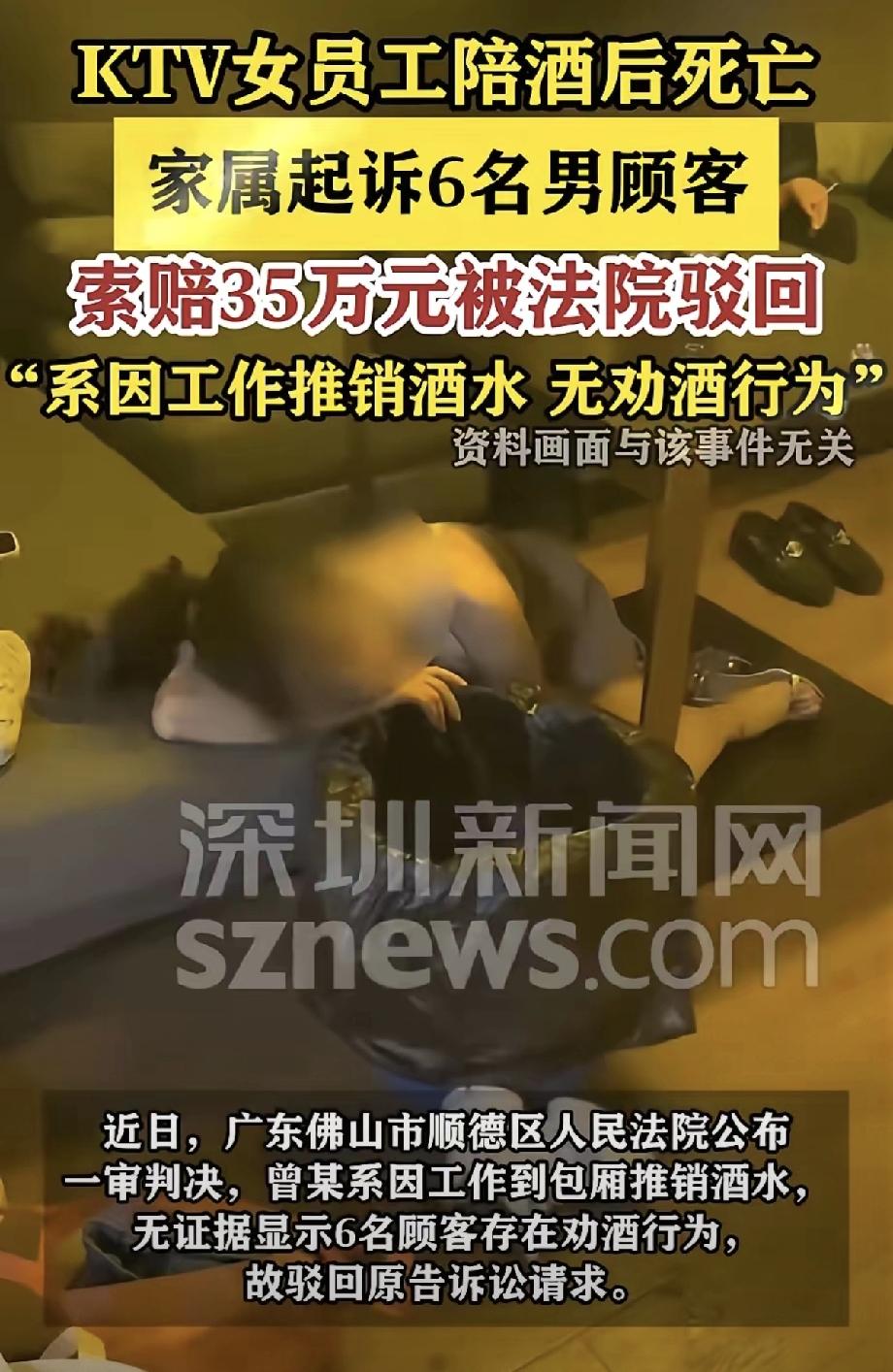 广东佛山顺德一家KTV里,发生了一起让人揪心的悲剧,一条年轻的生命永远停在了工作岗位上,还牵扯出一场闹上法庭的纠纷。事发那天晚上,KTV女员工曾某像往常一样上班,负责给包厢里的顾客推销酒水,这是她的本职工作,每天都要面对不同的客人,礼貌周到是基本要求。 当天晚上,V06包厢里来了6名男顾客,他们点了歌和酒水,曾某按照流程走进包厢,一边介绍店里的酒水套餐,一边陪着客人礼貌性地喝了几口,没有过量,也没有被强迫,全程都是工作式的应酬。 大概喝了十几分钟,曾某说自己有点累,就找了包厢角落的沙发坐下休息,6名男顾客也没在意,继续唱歌喝酒,期间没人再劝她喝酒,也没人主动和她搭话。 没人知道,这一休息,竟然成了曾某和这个世界的最后交集,更没人预料到,这场普通的酒局,会在后续引发一场关于责任的争论。 一直到次日凌晨一点多,6名男顾客的酒局散了,几个人收拾好东西就各自回家,离开的时候,他们看了一眼角落里的曾某,她闭着眼睛靠在沙发上,看起来只是睡着了,神志也比较清醒,没有出现醉酒昏迷的样子。 所以没人上前叫醒她,也没人想着要送她回家或者联系KTV工作人员。他们不知道,自己这一走,留下的不仅是熟睡的曾某,还有后续无法挽回的遗憾。 男顾客们离开后没多久,大概凌晨两点半左右,KTV的保洁人员李某和何某按照规定去打扫V06包厢,一进门就看到曾某独自坐在沙发上哭,肩膀一抽一抽的,看着很委屈。 两人愣了一下,想上前问问情况,可又怕多管闲事,毕竟KTV里经常有客人或员工因为工作不顺心或者喝多了情绪低落,加上他们只是负责保洁,没有处理这类事情的权限。 犹豫了半天,最终还是没敢上前,只是简单打扫了包厢外围,就悄悄离开了,没把这件事告诉KTV的管理人员。这一放,就放成了无法挽回的悲剧。 从凌晨一直到当天下午五点多,期间再也没有人去过V06包厢,也没有人想起那个还在沙发上的女员工。直到有KTV工作人员去检查包厢,准备迎接晚上的客人,才发现曾某一动不动地躺在沙发上,脸色苍白,无论怎么呼唤都没有回应。 工作人员吓得赶紧拨打了120和110,可医务人员赶到现场后,确认曾某已经不幸死亡,没有了任何生命体征。 噩耗传到曾某家属耳朵里,一家人瞬间崩溃,好好的一个人,上班的时候还好好的,怎么突然就没了。悲痛之余,家属们把矛头指向了当晚和曾某一起喝酒的6名男顾客,他们认为,这6名男子和曾某共同饮酒,明知曾某喝了酒,却在离开时不管不顾,没有尽到基本的照顾义务。正是因为他们的疏忽,才导致了曾某的死亡,所以他们理应承担责任。 为了给死去的曾某讨一个说法,家属们一纸诉状将这6名男顾客告上了佛山市顺德区人民法院,要求他们共同赔偿死亡赔偿金、丧葬费、精神损害抚慰金等共计35万元。 而6名男顾客得知自己被起诉后,都觉得十分委屈,他们表示,自己只是正常到KTV消费,并没有主动邀请曾某喝酒,也没有强迫她饮酒。曾某喝酒是出于工作需要,属于她的职务行为。 更让他们觉得无辜的是,离开的时候,曾某意识清醒,状态正常,根本没有表现出任何不适,他们根本无法预见后续会发生意外。 而且曾某是在KTV的工作场所内,她的安全保障义务应该由KTV承担,而不是已经离场的他们。随着案件的审理,更多细节被披露出来,公安部门的询问笔录显示,没有任何证据证明6名男顾客存在劝酒、灌酒的行为。 保洁人员也证实,凌晨看到曾某时,她只是在哭,身体没有出现明显异常。法院经过详细审理,结合监控视频、证人证言和各项证据,最终做出了一审判决,驳回了曾某家属的全部诉讼请求,认定6名男顾客不需要承担任何赔偿责任。 很多人看到这个判决后,都有不同的看法,有人觉得家属的心情可以理解,但法律讲究证据,没有过错就不应该担责。 也有人觉得,不管怎么说,一起喝了酒,多少都有几分责任,看着人独自留在包厢,怎么能不管不顾。这场悲剧的背后,不仅有一个家庭的破碎,更牵扯出很多值得大家思考的问题。6名男顾客真的没有任何责任吗?KTV作为用人单位,在员工出现异常时没有及时发现和救助,是否应该承担责任? 保洁人员看到曾某哭泣却选择漠视,又是否有过错?大家不妨说说自己的看法,如果你是当晚的男顾客,离开时会怎么做?如果你是保洁人员,看到有人独自哭泣,会选择上前询问还是默默离开?