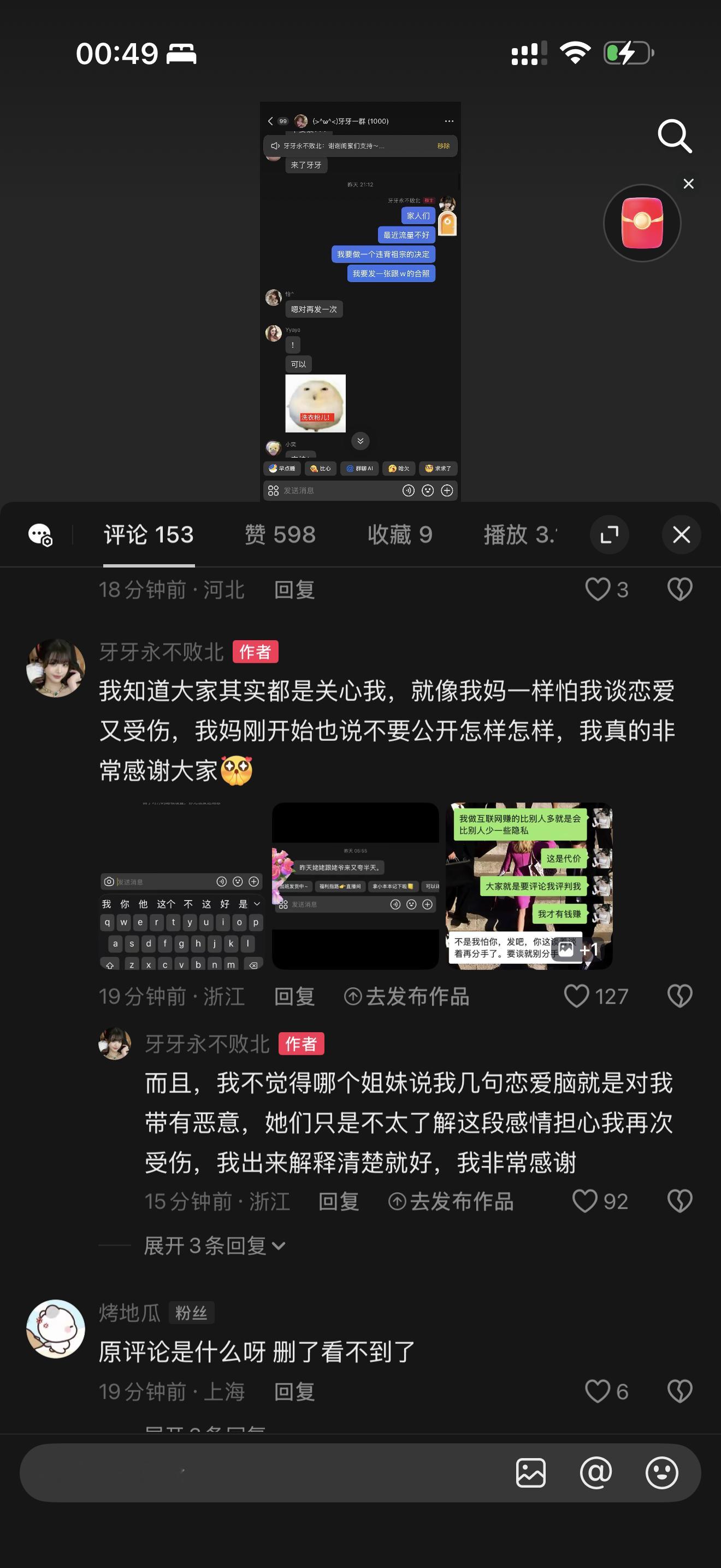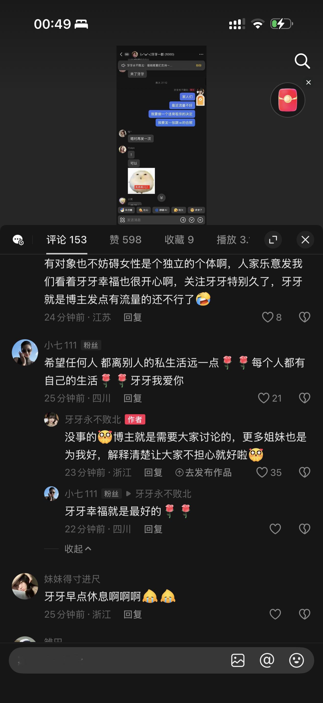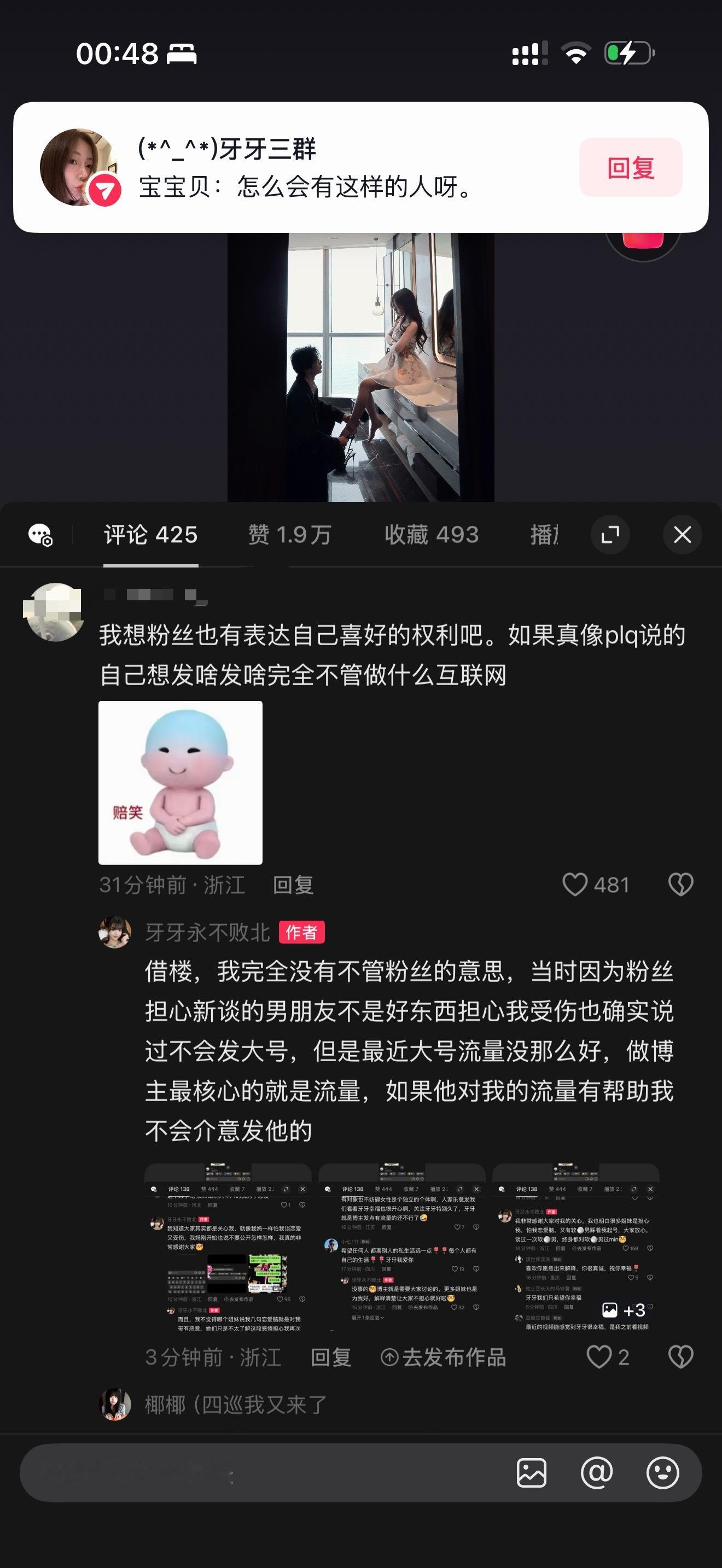 这点必须解释,我完全没有不管粉丝的意思从刚开始谈恋爱只在小号发一些暧昧情愫的视频到不露脸合照到发正面,我都是非常在意大家感受,生怕大家有一点不舒服其实把他发大号说一千道一万我无非就是想要流量我不觉得我的生活不关大家的事,因为我是博主一开始确实是说过不发大号,大家不希望我发大号的原因是因为怕我识人不清被吃软饭以及担心对我事业有损,所以我就想着解释出来就好,我只是想回应争议,没有挂谁的意思做互联网最核心的就是流量,如果发情侣内容对我的互联网账号有增益,我不会不发他还是那句话:我感谢大家也感恩大家,大家不管是反对还是支持都只是怕我受伤,谢谢大家