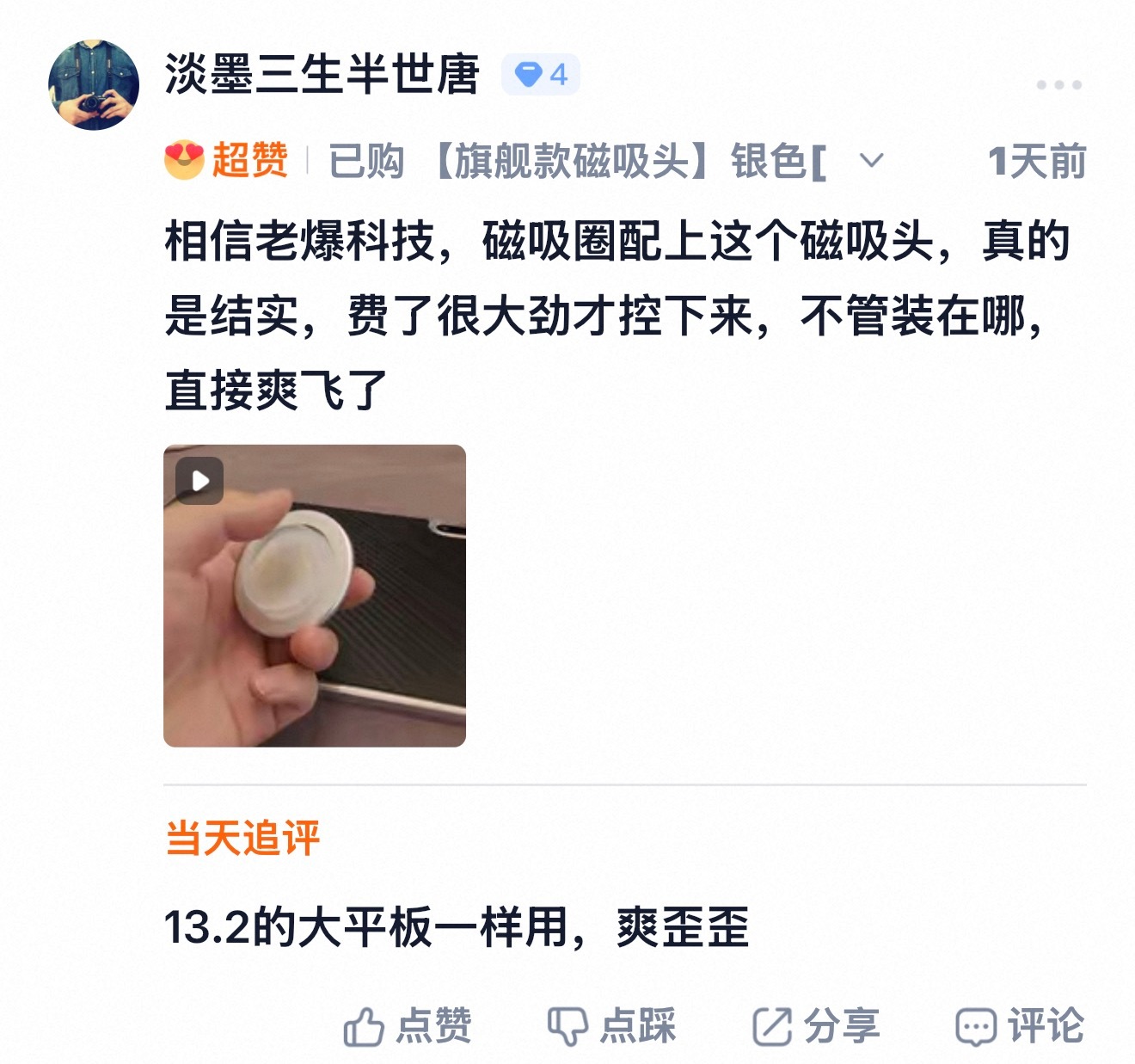 无论多大的平板,旗舰磁吸头+吸盘+平板专用引磁片的组合都能给你吸住,而且稳稳的,放心😊