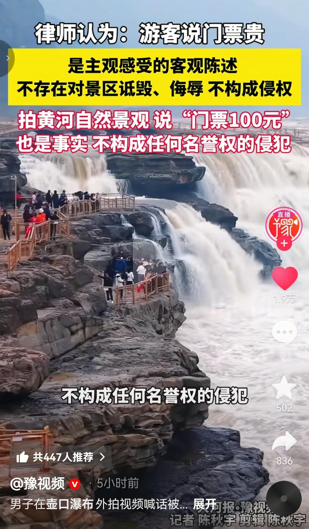笑不活了!只因男子在壶口瀑布外喊“妈,门票100,不进去了”,结果,被景区投诉侵犯名誉权?! 3月17日,一男子在壶口瀑布外拍视频,对着镜头喊了句:“妈,我们来看你了,门口要钱一人100,我们就不进去了”。 就这么一句带着点调侃的大实话,居然被景区投诉侵犯名誉权,视频还被要求下架! 更离谱的是,事情发酵后,山西壶口瀑布景区赶紧跳出来撇清:“事发地是陕西那边!不在我们这儿,我们也是受害者!” 陕西那边又说“不了解具体情况”,两边踢起了皮球,把男子夹在中间当皮球踢。 律师对此表示:人家说门票100是事实,说“贵”是主观感受,既没诋毁也没侮辱,根本不构成侵权!拍的是黄河自然景观,连壶口景区几个字都没提,这也能叫侵犯名誉权? 网友看到后评论说:“100块门票本来就不便宜,还不让人说了?这景区是听不得半句实话?” 也有的网友说:“壶口瀑布是大自然的,什么时候成你们公司开发的了?圈地收钱还不让人吐槽?” 也有的网友说出自己的感受:“我也觉得100块不值,难道我也要被投诉?这吃相太难看了!” 还有的网友说:“如果这都能算侵犯名誉权?以后谁还敢说景区一句不好?” 我真的搞不懂,现在有些景区是不是太把自己当回事了? 大自然的鬼斧神工,被你们圈起来收门票就算了,连游客说一句“门票贵、不进去了”都要被扣上“侵犯名誉权”的帽子,这不是典型的只许州官放火,不许百姓点灯吗? 山西景区急着甩锅,陕西景区装聋作哑,本质都是怕影响自己的生意,却完全不顾游客的感受。100块门票值不值,游客心里有数,用投诉下架视频的方式捂嘴,只会让更多人反感! 这哪里是维护名誉,分明是傲慢的霸权主义在作祟! 我们总说“绿水青山就是金山银山”,可真正的金山银山,从来不是靠圈地收费、捂嘴禁言换来的,而是靠真诚的服务、合理的价格,让游客心甘情愿地来、开开心心地走。 如果连一句实话都听不得,连正常的吐槽都容不下,那所谓的“5A景区”,不过是个只会收钱、听不得批评的“玻璃心巨婴”。 最后,我想说的是: 别让圈地收费的贪婪,寒了游客的心;别让捂嘴禁言的傲慢,毁了自然的美! 对此,你怎么看?