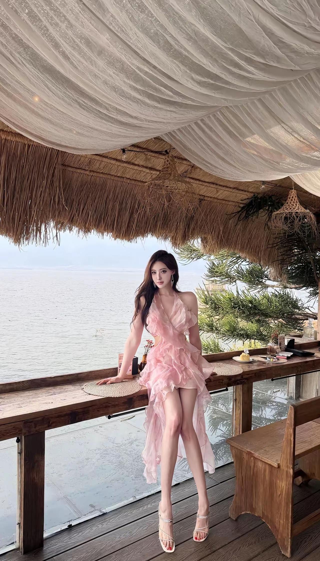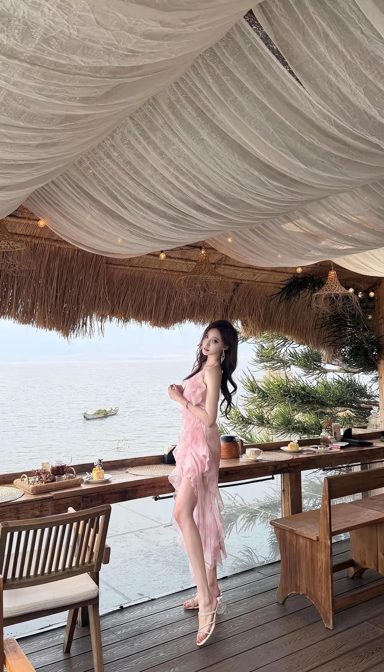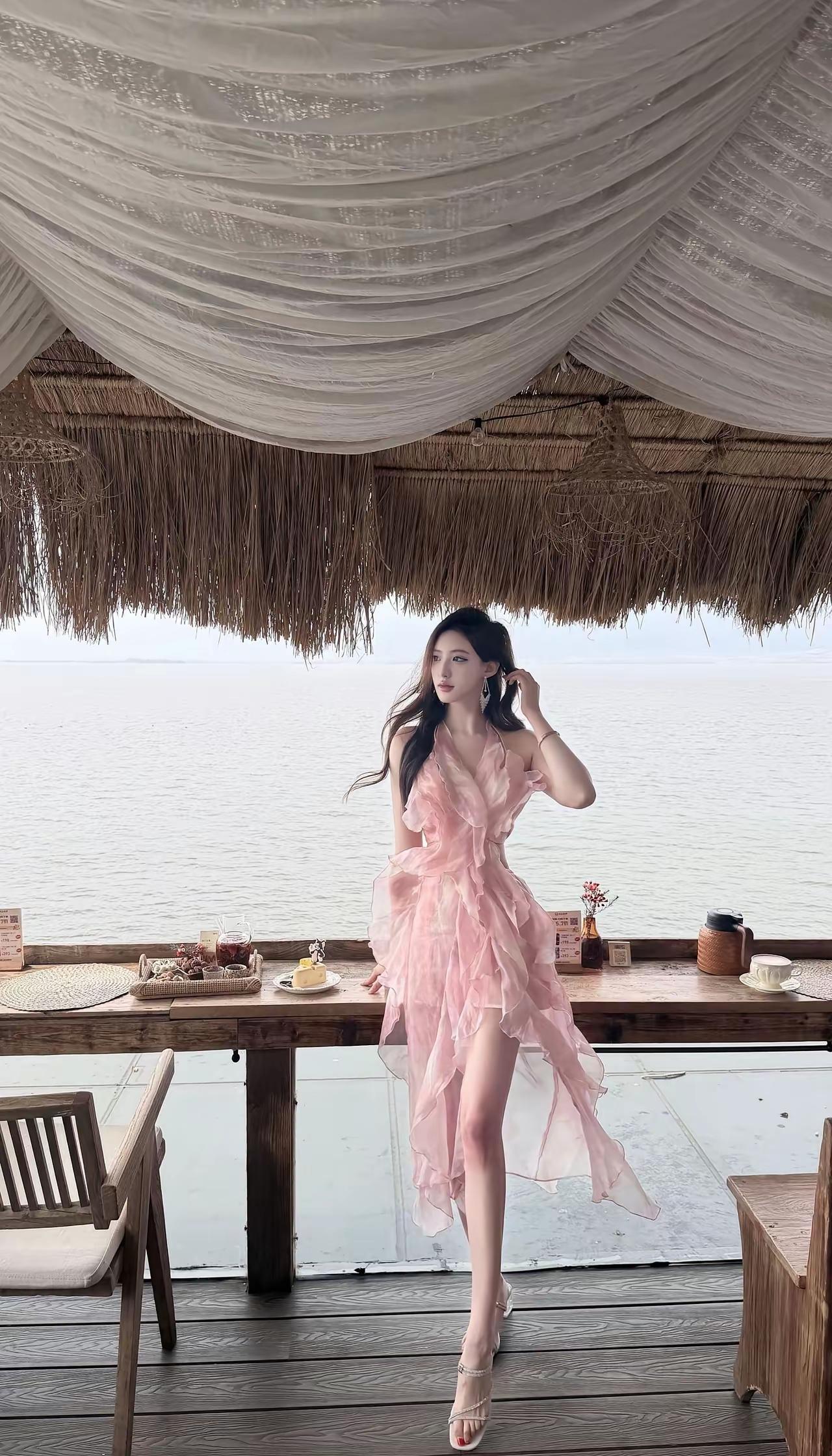 海边度假风,粉色连衣裙,享受悠闲时光