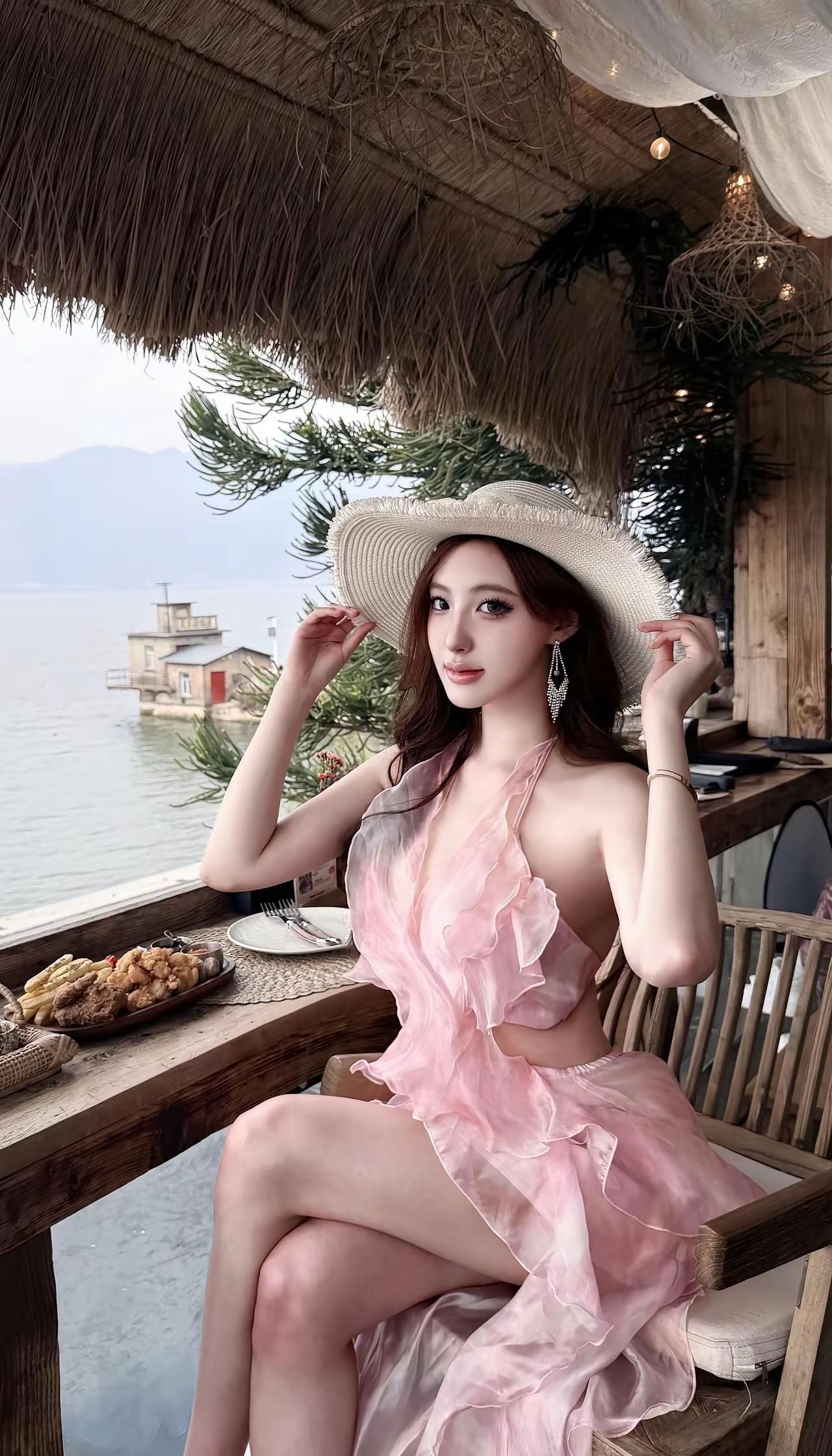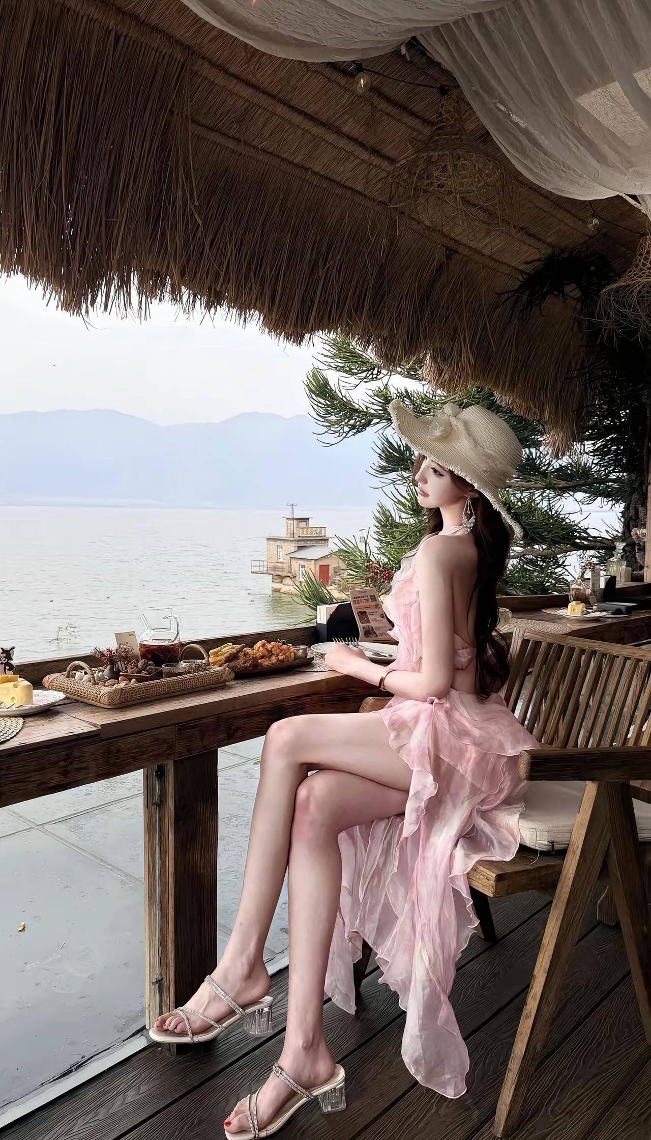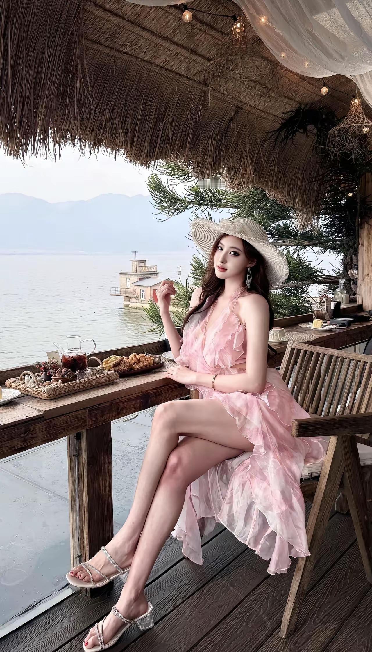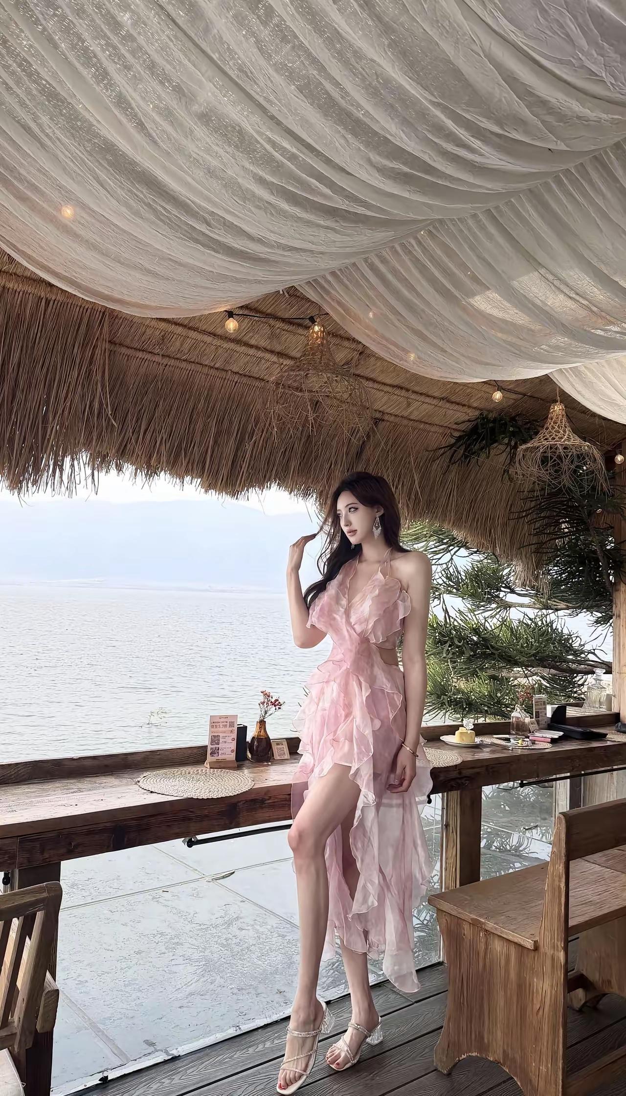 海边度假风,粉色连衣裙,享受悠闲时光
