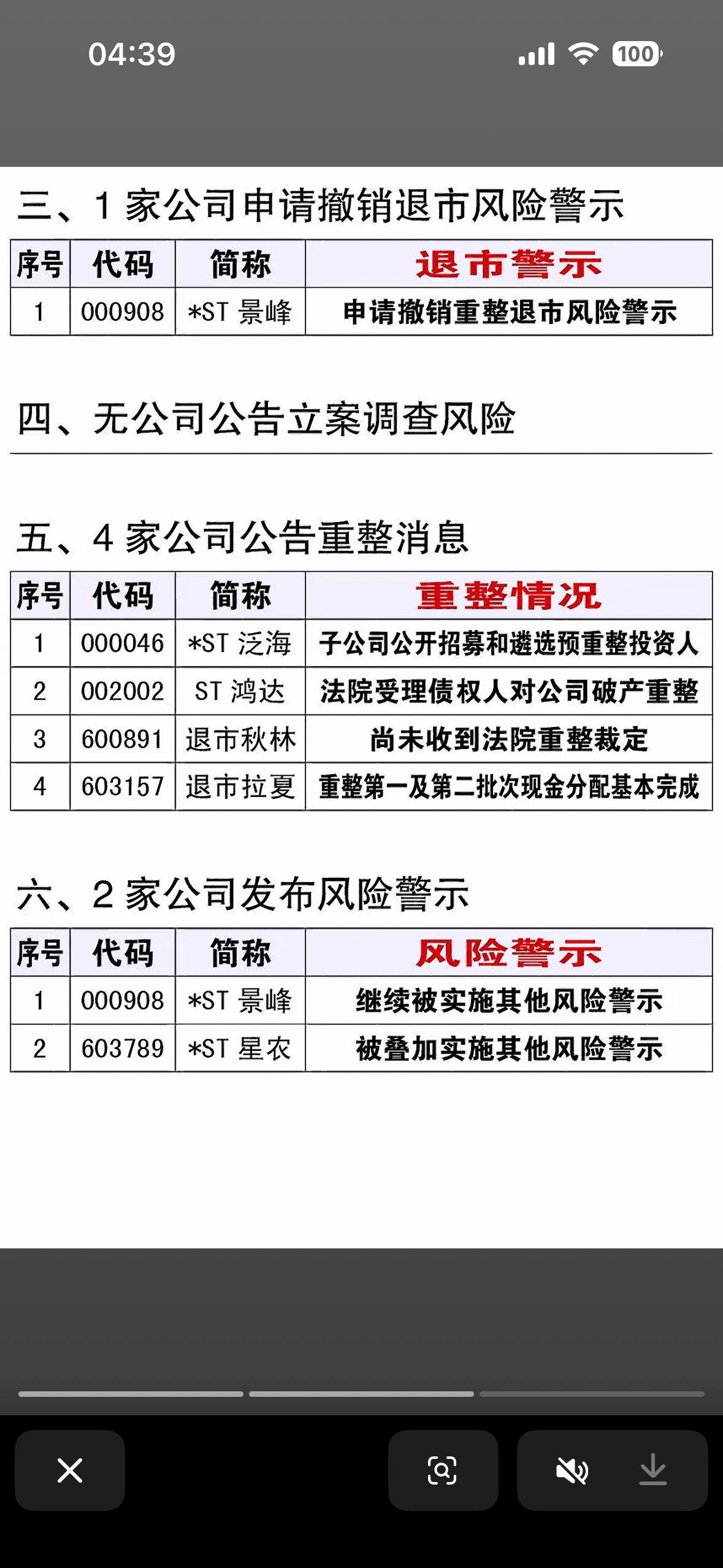 3月18日退市、立案、重整、风险提示。 3月18日,在资本市场可是个“多事之秋”,退市、立案、重整、风险提示这些事儿扎堆出现。就说退市,意味着公司要告别股市舞台,投资者的钱可能就打水漂了,像之前一些ST股退市,股民损失惨重。立案则是监管出手调查公司的违规行为,一旦查实,公司信誉和股价都会一落千丈。重整是公司试图“起死回生”的手段,不过成功的难度不小。而风险提示就像是给投资者敲警钟,可很多人还是会被利益冲昏头脑,一头扎进去,最后可能落得血本无归。这一天,不知道又有多少人的财富命运被改写。