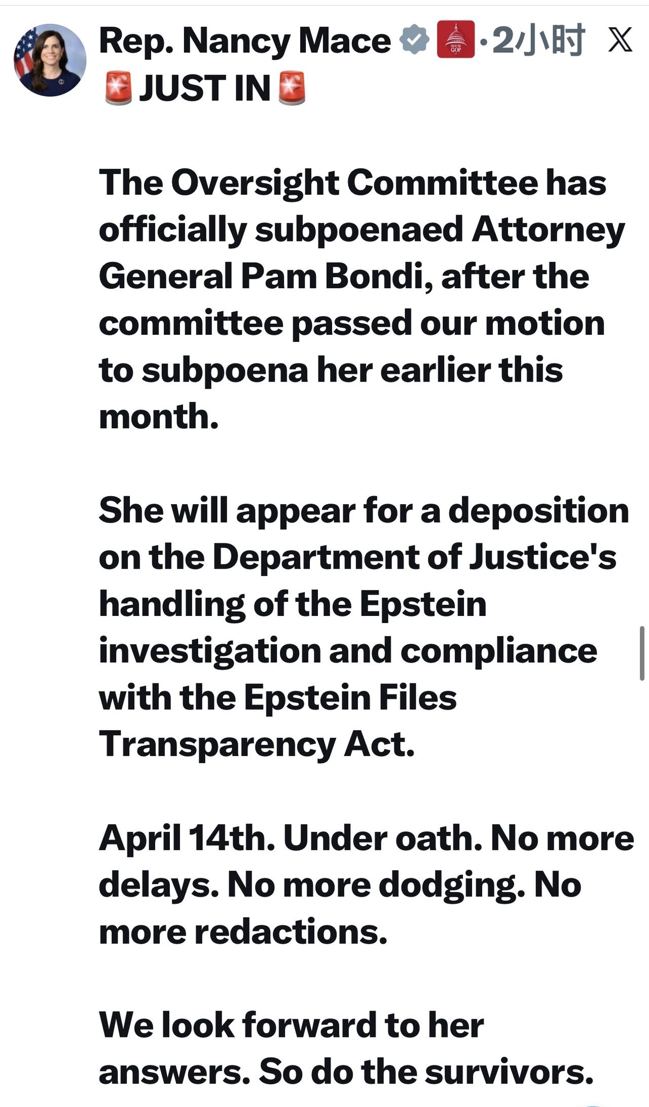 美国南卡罗来纳州众议员南希.梅斯: “监督委员会已正式向司法部长帕姆·邦迪发出传票,此前该委员会于本月初通过了传唤她的动议。 她将出席作证,就司法部对爱泼斯坦调查的处理以及对《爱泼斯坦档案透明法案》的遵守情况作证。 4月14日。宣誓作证。不再拖延。不再回避。不再隐瞒。 我们期待她的答复。幸存者们也一样。”